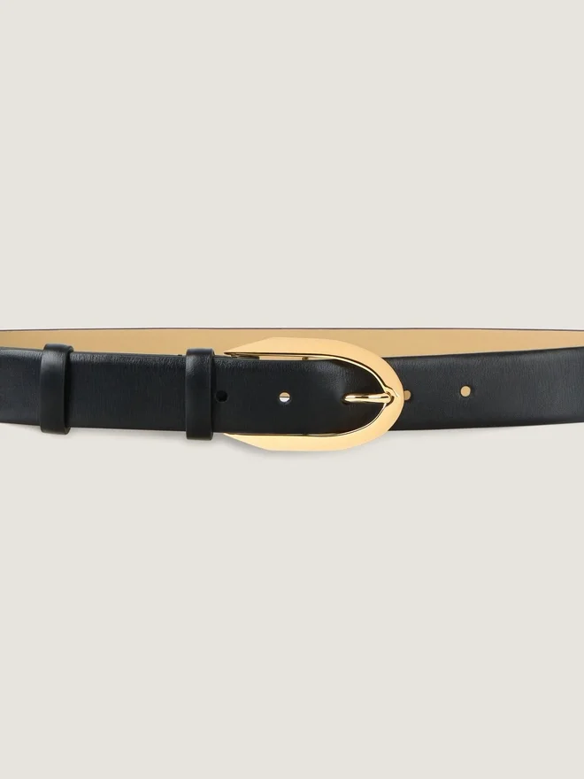 Gürtel aus glattem Kalbsleder. Pinch-Linie. Metallschnalle mit goldenem Finish. Breite: 3 cm.
