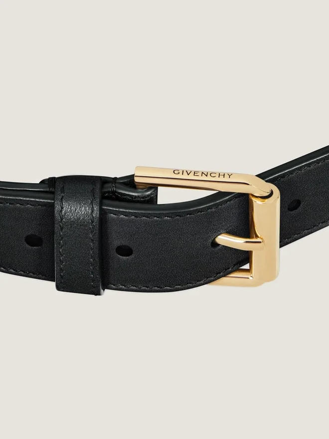 Langer Gürtel aus glänzendem Kalbsleder. Voyou-Linie. Endstück aus Metall mit Givenchy-Gravur. Metall-Details mit Goldfinish.