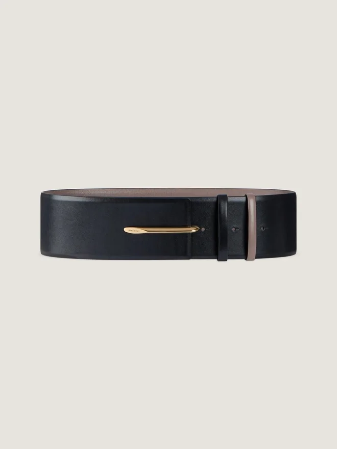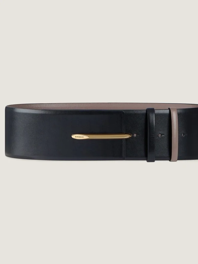 Wendbarer Gürtel aus glattem Kalbsleder. Pinch-Linie. Metall-Pinch mit Goldfinish und Givenchy-Gravur. Breite: 7 cm.