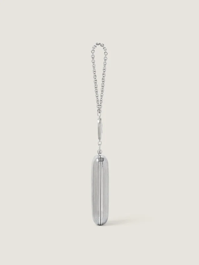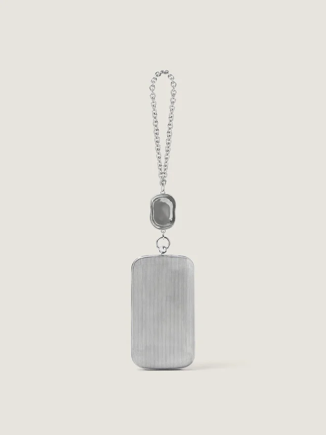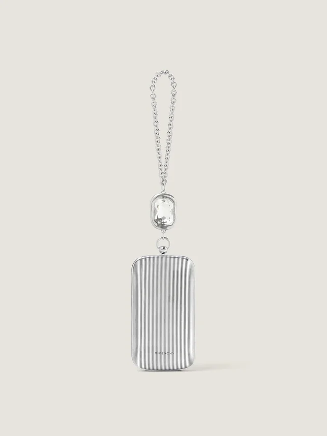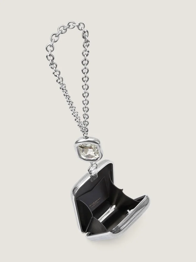 Abend-Clutch aus Metall mit silberfarbenem Finish. Funktionales Metallscharnier. Kettenriemen mit Metallring und Kristallverzierung. Givenchy-Signatur