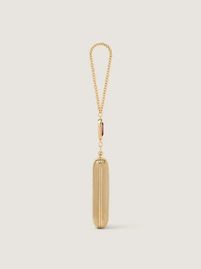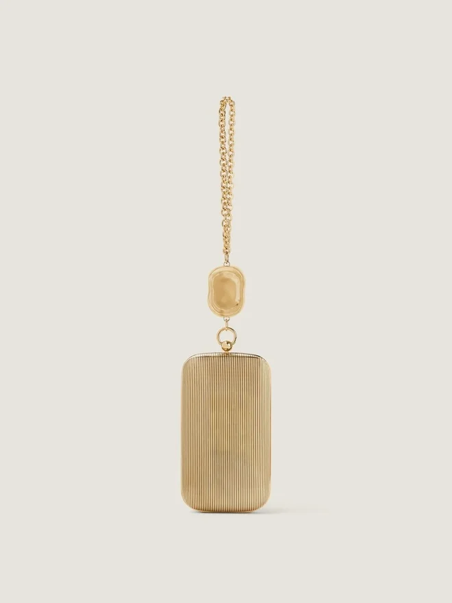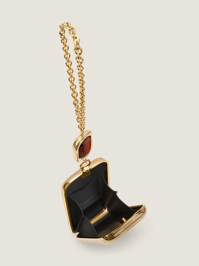 Abend-Clutch aus Metall mit goldenem Finish. Funktionales Metallscharnier. Kettenriemen mit Metallring und Kristallverzierung. Givenchy-Signatur
