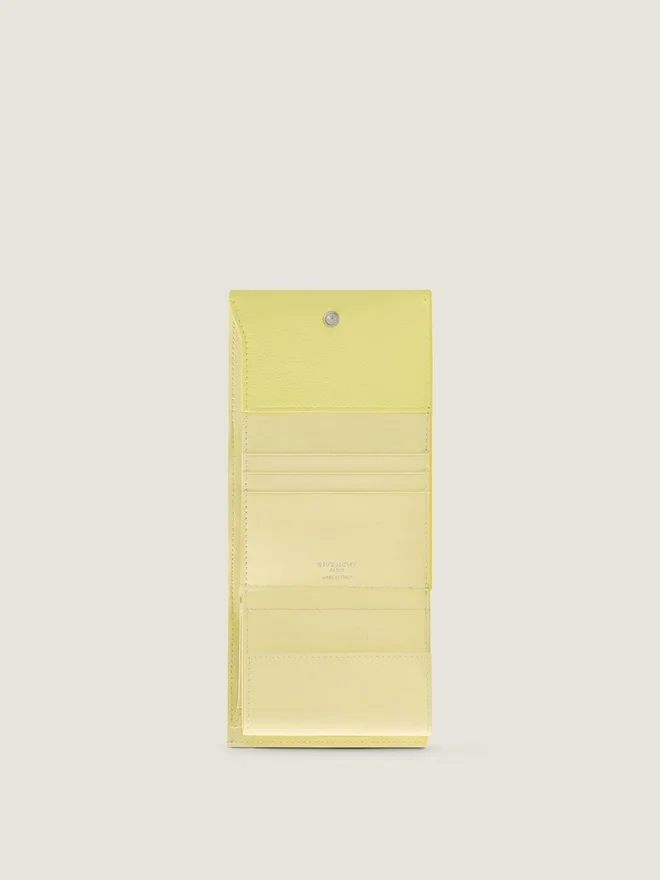 Geldbörse aus genarbtem Leder.Day Line.Druckknopfverschluss.Silberfarbene Givenchy-Signatur auf der Vorderseite.Geprägte Givenchy-Signatur auf der Rückseite.Silberfarbene Givenchy Paris-Signatur auf der Innenseite.• Mit Leder überzogener Knopf auf der Vorderseite. • Ein Münzfach mit Druckknopf. • Ein flaches Geldscheinfach und fünf Kartenfächer. • • Kontrastierendes Innenfutter. Futter: 100 % Lammleder, 100 % Viskose.Abmessungen3,9 Zoll x 3,5 Zoll x 1,2 Zoll