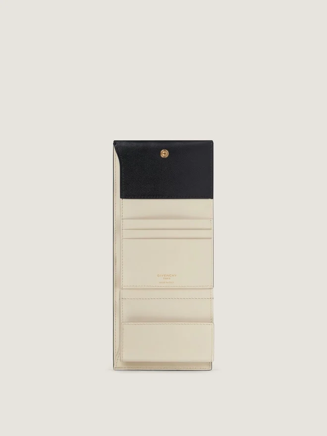 Geldbörse aus glänzendem Kalbsleder.Day Line.Druckknopfverschluss.Goldene Givenchy-Signatur auf der Vorderseite.Heißgeprägte Givenchy-Signatur auf der Rückseite.Goldene Givenchy-Signatur auf der Innenseite.• Mit Leder bezogener Knopf auf der Vorderseite. • Ein Münzfach mit Druckknopf. • Ein flaches Geldscheinfach und vier Kartenfächer. • Kontrastfarbenes Innenfutter. Futter: 100 % Lammleder.Abmessungen3,9 Zoll x 3,5 Zoll x 1,2 Zoll