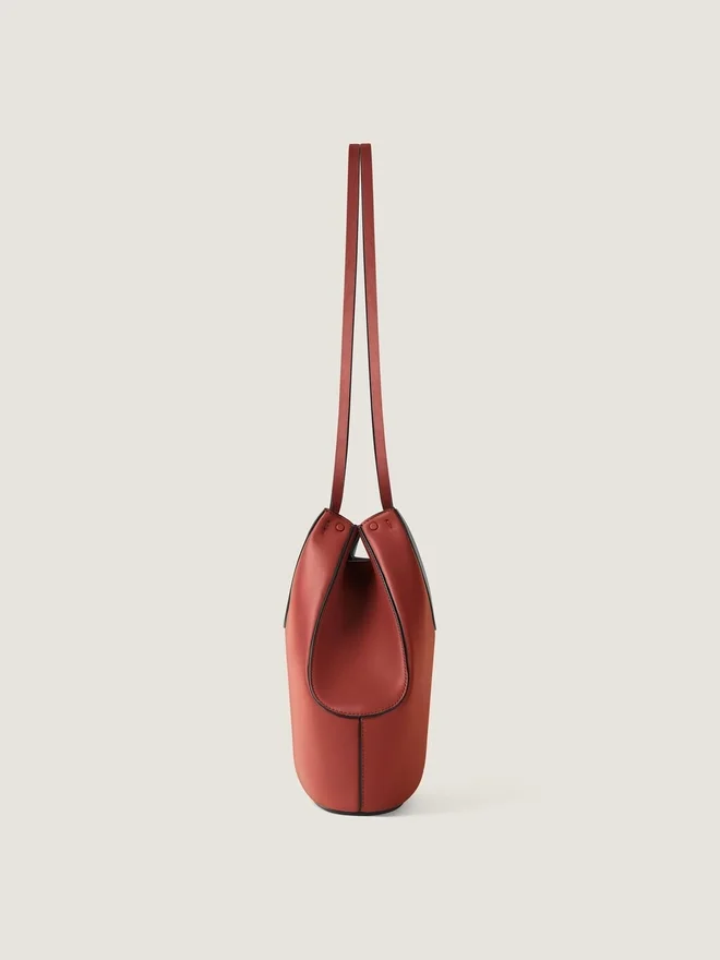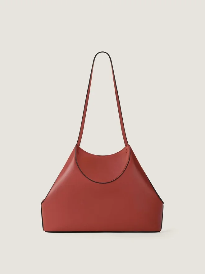 Kleine Tragetasche aus weichem, genarbtem Kalbsleder. Facet-Linie. Geometrische Form. Magnetverschluss. Ledergriffe zum Tragen über der Schulter