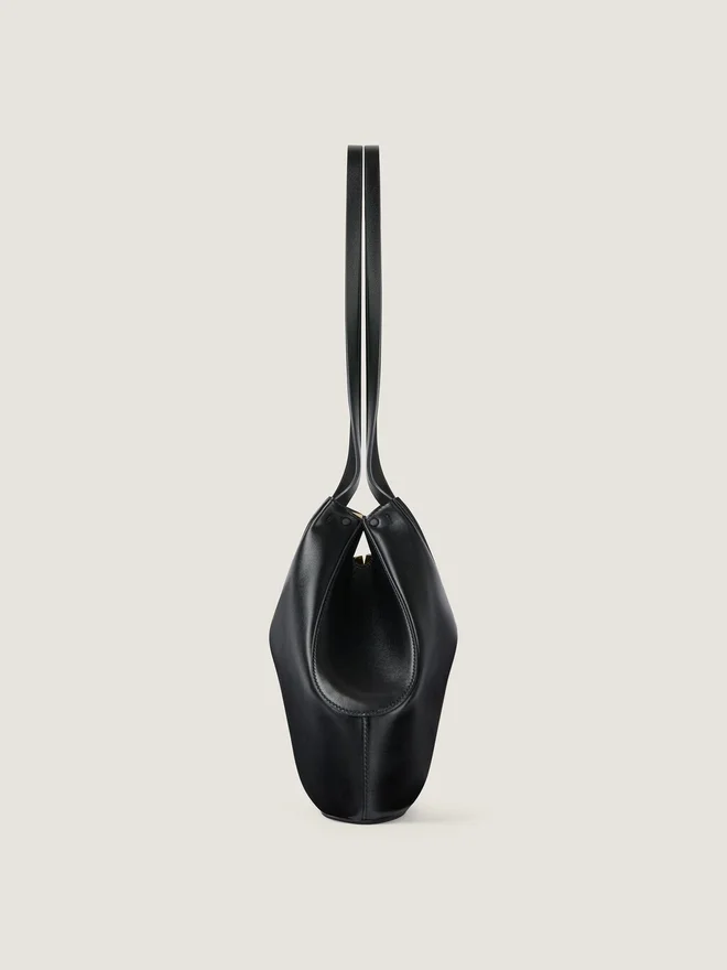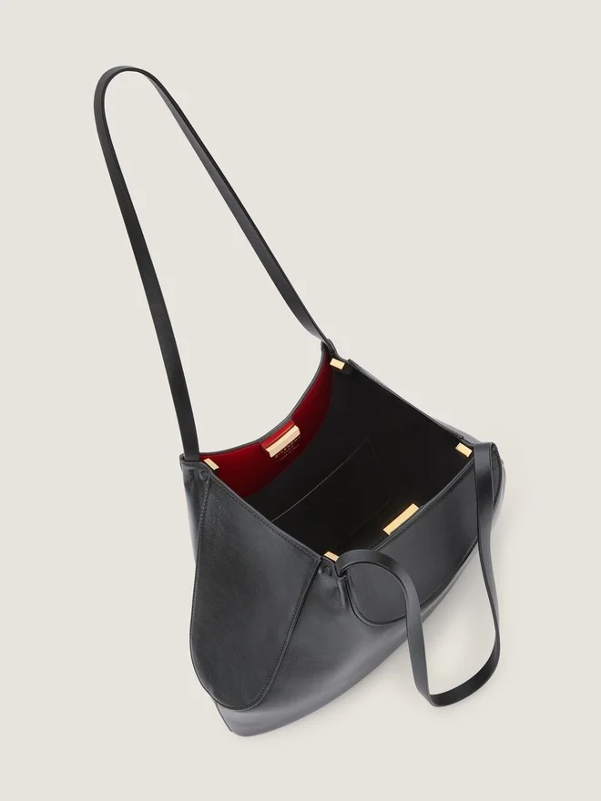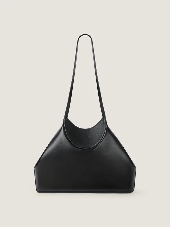 Kleine Tragetasche aus weichem, genarbtem Kalbsleder. Facet-Linie. Geometrische Form. Magnetverschluss. Ledergriffe zum Tragen über der Schulter