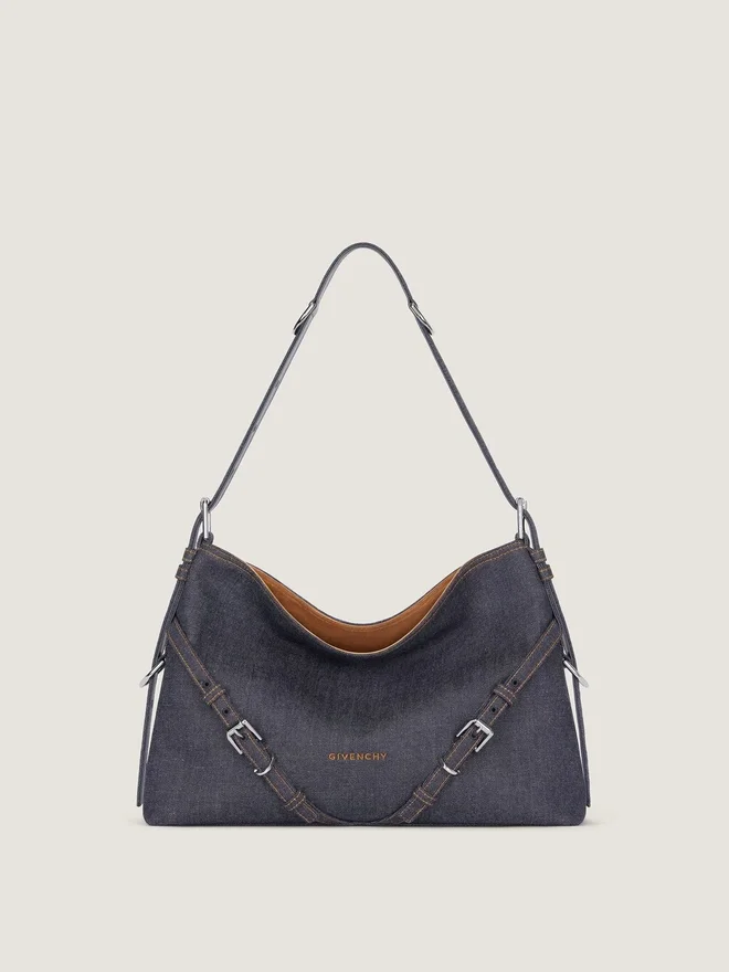 Mittlere Umhängetasche aus Denim mit Kontrastnähten.Voyou-Linie.V-förmige, lockere Silhouette und großzügiges Volumen.Verstellbarer Schulterriemen für das Tragen in der Hand, über der Schulter oder quer über den Körper.Givenchy-Signatur auf der Vorderseite der Tasche gestickt. Zarte, mit Givenchy gravierte Metallschnallen. Metall-Details mit silbernem Finish. Ein Hauptfach und eine Reißverschlusstasche im Inneren. Futter aus Wildleder.Farbe:IndigoblauMaterial:100 % Baumwolle. Futter: 100 % Kalbsleder.Maße:38 cm x 31 cm x 10 cmRiemenlänge:Min: 25 cm • Max: 55 cm 18 cm x 13,5 cm x 3,6 cm Kartenfach Ja Brillenetui – Taschenschirm – iPhone 13 Ja Taschenbuch – iPad Pro – MacBook Air –Was passt in Ihre Mini Voyou Bag? Maße: 29,5 cm x 11 cm x 16,5 cm
