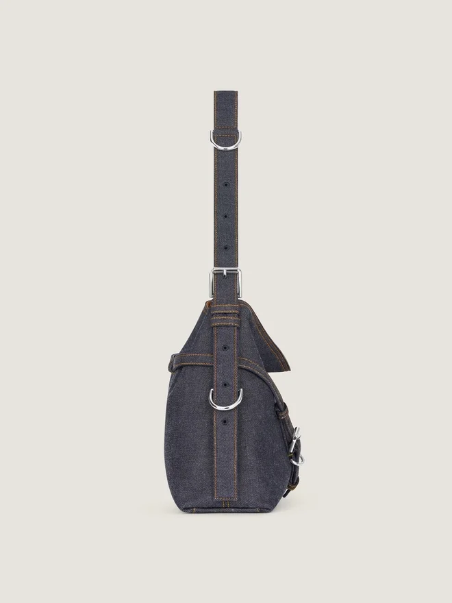 Mittlere Umhängetasche aus Denim mit Kontrastnähten. Voyou-Linie. V-förmige, lockere Silhouette und großzügiges Volumen. Verstellbar