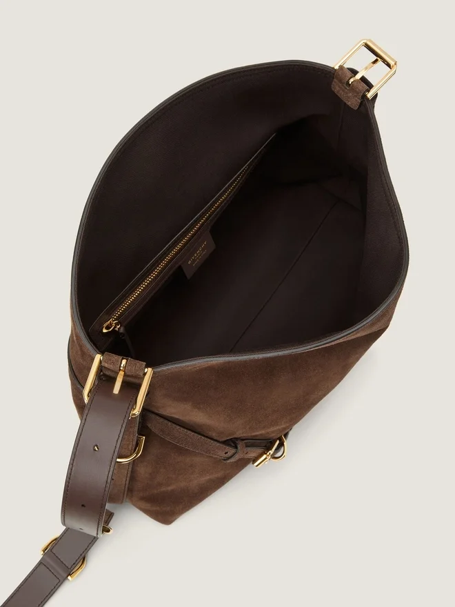 Mittlere Umhängetasche aus Kalbsveloursleder.Voyou-Linie.V-förmige, lockere Silhouette und großzügiges Volumen.Verstellbarer Schulterriemen für das Tragen in der Hand, quer über den Körper oder über der Schulter.Givenchy-Signaturprägung auf der Vorderseite der Tasche und oben am Riemen. Givenchy Paris-Patch auf der Innenseite. Metallschnallen mit Givenchy-Gravur. Metall-Details in Goldoptik.• Ein Hauptfach und eine Reißverschlusstasche im Inneren. • Futter aus Canvas. FarbeEbenholzbraunGrößeMittelMaterialzusammensetzung100 % Kalbsleder.Abmessungen15 Zoll x 12,2 Zoll x 3,9 ZollRiemenlängeMin: 25 cm • Max.: 55 cm HerkunftslandItalienArtikelnummerBb5131B2Gk-202Was passt in Ihre Nano Voyou Bag? Maße: 18 cm x 13,5 cm x 3,6 cm Kartenfach Ja Brillenetui – Taschenschirm – iPhone 13 Ja Taschenbuch – iPad Pro – MacBook Air –Was passt in Ihre Mini Voyou Bag? Maße: 29,5 cm x 11 cm x 16,5 cm