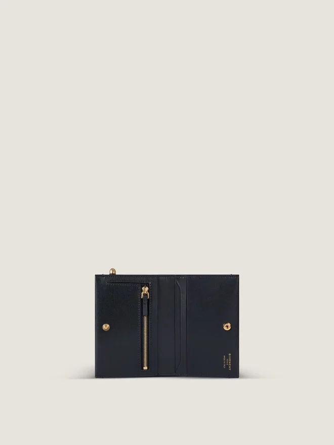 Zweifach gefaltete Geldbörse aus Kalbsleder mit natürlicher Narbung und strukturierter Oberfläche.Pinch-Linie.Druckknopfverschluss.Metallklammer mit goldenem Finish und Givenchy-Gravur.Goldene Givenchy Paris-Signatur auf der Innenseite.Ein Münzfach mit Reißverschluss.Ein Geldscheinfach und drei Kartenfächer.D FarbeD SchwarzD MaterialD 100 % Kalbsleder. Futter: 100 % Viskose, 100 % Lammleder.D MaßeD 4,9 Zoll x 3,9 Zoll x 0,8 Zoll