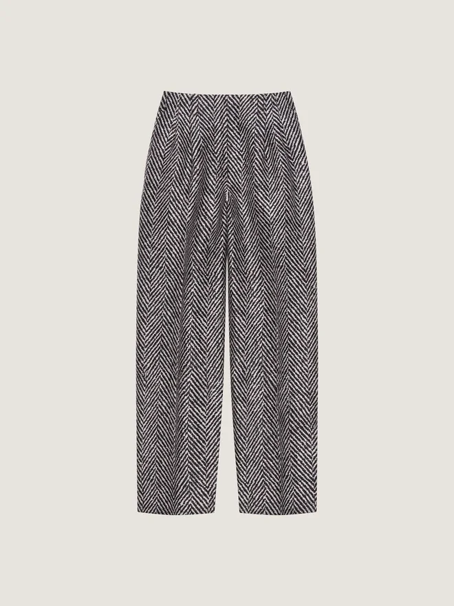 Hose mit doppelten Falten aus gemischter Wolle im Fischgrätenmuster. Gummizug am Rücken. Reißverschluss mit Haken. Zwei Seitentaschen. Eine Gesäßtasche