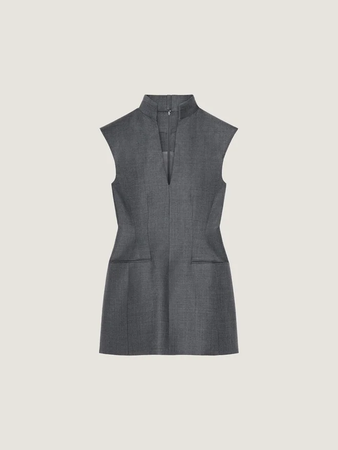 Kurzes, ärmelloses, tailliertes Kleid aus Wolle. Strukturierter V-Ausschnitt. Verdeckter Reißverschluss am Rücken. Zwei Vordertaschen. Tailliert