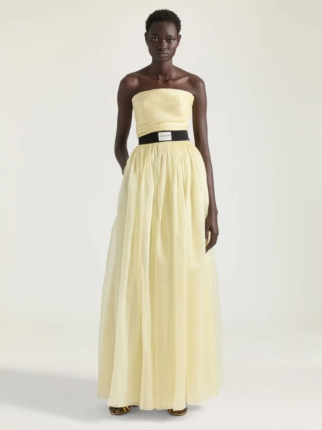 Als Givenchy-Klassiker wird das Bustier in verschiedenen Silhouetten neu interpretiert, wobei strukturelle Couture-Techniken zum Einsatz kommen, um die