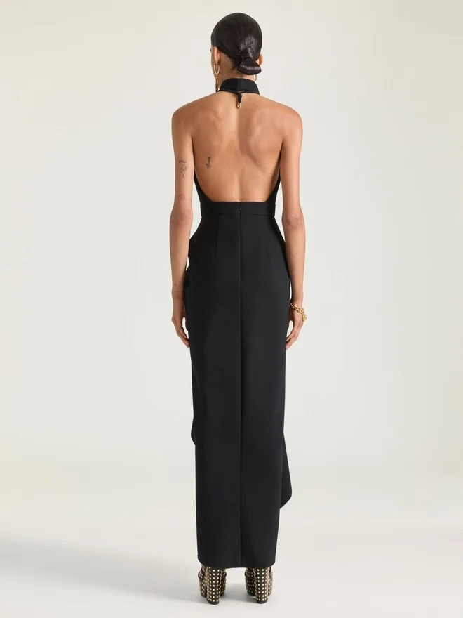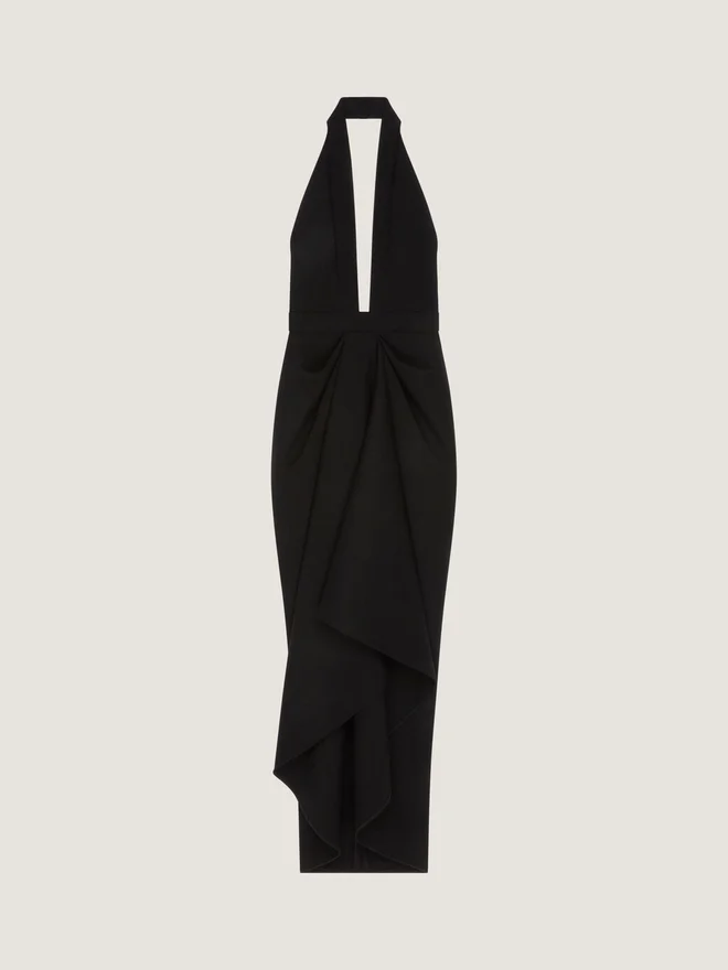 Eine Silhouette, inspiriert von der Geste, eine Lederjacke über eine Schaufensterpuppe zu drapieren. Die Stoffe sind sinnlich verdreht und um den Körper gewickelt, während Schlitze und Taschen auf der Vorderseite für Bewegung und Ausdruck sorgen.Langes, ärmelloses Kleid aus Wollkrepp.Tiefer Ausschnitt.Drapiert.Offener Rücken.Verdeckter Reißverschluss am Rücken und Hakenverschluss am Hals.• Das Model ist 1,77 m groß und trägt Größe 36. Futter: 74 % Acetat, 26 % Seide.