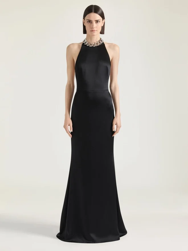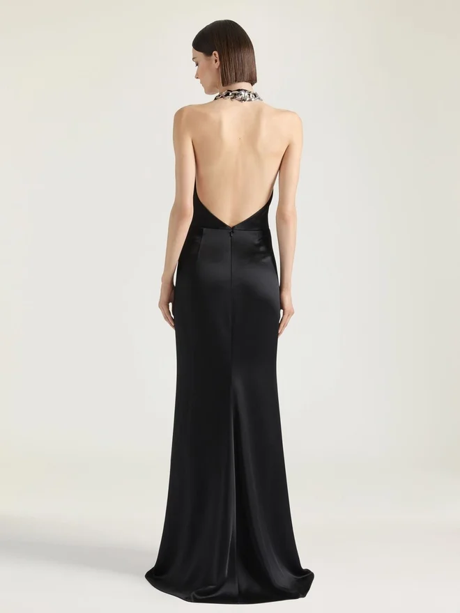 Langes Kleid aus Crêpe mit Satinrückseite. Neckholder. Offener Rücken. Verdeckter Reißverschluss am Rücken und Hakenverschluss am Hals. Modell
