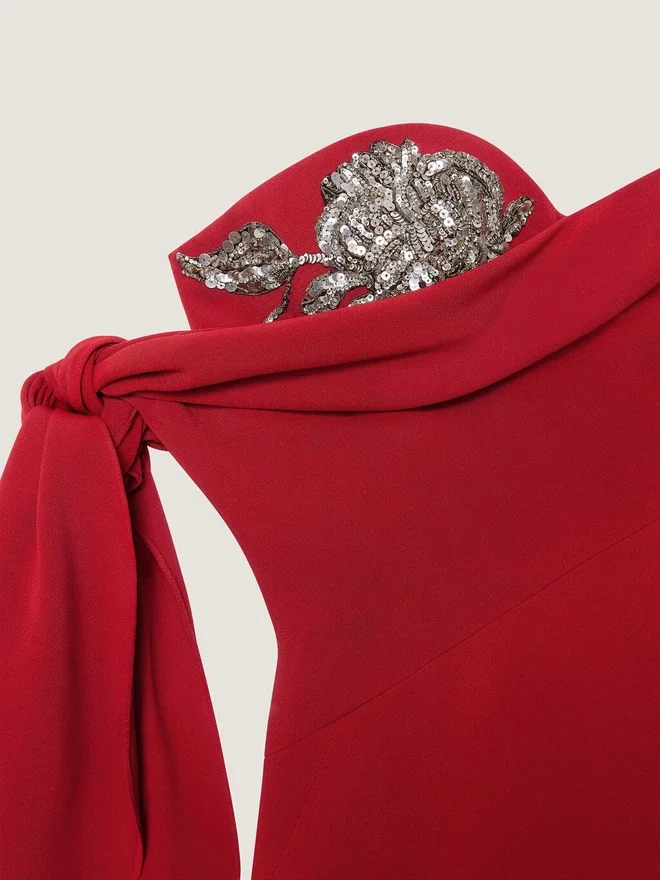 Als typisches Givenchy-Merkmal wird die Schleife als zentrales Detail hervorgehoben, verleiht den Kleidungsstücken Präsenz und Weiblichkeit und bringt die Handwerkskunst des Ateliers durch übertriebene Gesten zum Ausdruck. Langes Abend-Bustierkleid aus Crêpe Cady. Schleifendetail am Arm. Blumenstickerei aus Pailletten am Oberteil. Integriertes Korsett. Kickback-Detail.• Unsichtbarer Reißverschluss am Rücken. • Das Model ist 1,77 m groß und trägt Größe 36. Farbe Dunkelrot Material Hauptmaterial: 65 % Viskose, 32 % Acetat, 3 % Elasthan. Bustier: 77 % Polyester, 23 % Seide. Futter: Seide.PflegehinweiseNicht waschenNicht bügelnNicht im Wäschetrockner trocknenNicht bleichenNicht chemisch reinigenHerkunftslandFrankreichProduktcodeBw22Xc164K-601