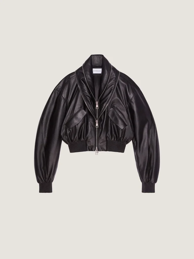 Bomberjacke aus Nappaleder.Schalkragen mit doppelten Reißverschlüssen.Reißverschluss.Zwei seitliche Pattentaschen.Elastischer Strickbund an Saum und Ärmelbündchen.Schrägnähte für einen kokonartigen Schnitt.Das Model ist 1,77 m groß und trägt Größe 36.FarbeSchwarzMaterialzusammensetzung100 % Lammleder. Sekundäres Material: 100 % Polyester. Futter: 100 % Viskose.PflegehinweiseNicht waschenNicht bügelnNicht im Wäschetrockner trocknenNicht bleichenNicht chemisch reinigenHerkunftslandItalienProduktcodeBw00Sp61Uj-001 Pflegehinweise: In unseren Ateliers entwerfen wir mutig und kreativ einzigartige Kleidungsstücke aus hochwertigen Materialien. Um die Schönheit Ihres Givenchy-Produkts zu bewahren, empfehlen wir, es in einem Staubbeutel aus Baumwolle an einem trockenen, kühlen Ort aufzubewahren. Für die meisten unserer Produkte wird eine chemische Reinigung empfohlen. Bitte beachten Sie unbedingt die Pflegehinweise auf dem Etikett Ihres Artikels. Besuchen Sie gerne unsere spezielle Seite oder wenden Sie sich direkt an unsere Givenchy-Teams, wenn Sie weitere Informationen wünschen.- Nicht waschen- Nicht bügeln- Nicht im Wäschetrockner trocknen- Nicht bleichen- Nicht chemisch reinigen