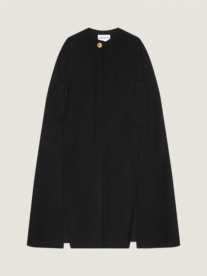 Langes Cape aus doppelseitigem Woll-Kaschmir-Gewebe. Rundhalsausschnitt. Verdeckter Knopfverschluss. Goldener Knopf mit Givenchy-Gravur. Armausschnitte.