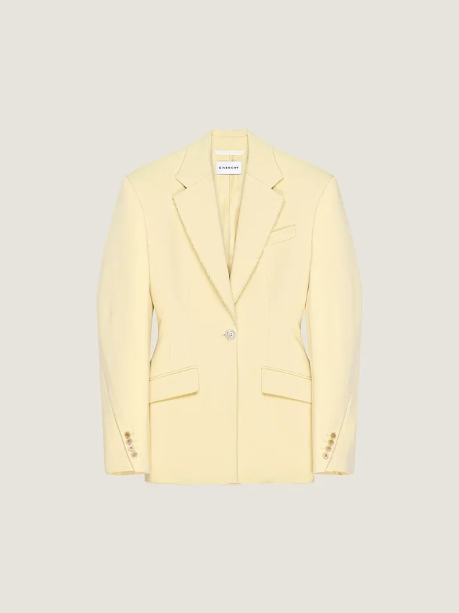 Das Volumen ist übertrieben, die Schnitte wurden überarbeitet und die Nähte umgekehrt, um die Kokon-Silhouette zu formen. Strukturierte Jacke aus doppeltem Wollkrepp. Kinnrevers. Einreihig.• Knopfmanschetten. • Silberfarbener Knopf mit Givenchy-Gravur. • Eine Brusttasche. • Zwei Pattentaschen vorne. • Unversäuberte Kanten. • Couture-Nähte für ein kokonartiges Volumen und eine taillierte Taille. • Satin-Futter.• Das Model ist 1,77 m groß und trägt Größe 36.D FarbeD ButterD MaterialD 90 % Wolle, 7 % Polyamid, 3 % Elasthan.D FutterD 100 % Polyester.D PflegeD Nicht waschenD Bei maximaler Bügeleisentemperatur (110 °C) ohne Dampf bügelnD Nicht im Wäschetrockner trocknenD Nicht bleichenD Nicht chemisch reinigenD Nicht im Gefrierschrank lagernD Nicht in der Waschmaschine waschenD Nicht in der Waschmaschine trocknenD Nicht in der Waschmaschine bügelnD Nicht in der Waschmaschine bügelnD Nicht in der Waschmaschine bügelnD Nicht in der Waschmaschine bügelnD Nicht in der Waschmaschine bügelnD Nicht in der Waschmaschine bügelnD Nicht in der Waschmaschine bügelnD Nicht in der Waschmaschine bügelnD Nicht in der Waschmaschine bügelnD Nicht Futter: 100 % Polyester.