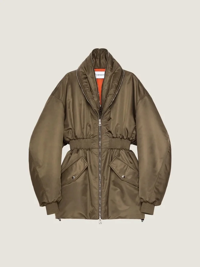 • Hourglass-Bomberjacke aus Nylon.• Schalkragen mit doppelten Reißverschlüssen.• Reißverschluss.• Zwei seitliche Pattentaschen.• Elastischer Strickbund an Taille und Ärmelbündchen.• Kontrastfarbiges Futter.• Couture-Nähte für einen kokonartigen Schnitt und eine taillierte Taille. • Das Model ist 1,77 m groß und trägt Größe 36. Zusatzmaterial: 100 % Polyester.PflegehinweiseNicht waschenBei maximaler Bügeleisentemperatur (110 °C) bügeln Ohne DampfNicht im Wäschetrockner trocknenNicht bleichenChemische Reinigung mit KohlenwasserstoffenHerkunftslandPortugalProduktcodeBw00Th14Jd-305 Pflegehinweise: Unsere Ateliers entwerfen mutig und kreativ einzigartige Kleidungsstücke, die aus hochwertigen Materialien gefertigt sind. Um den Glanz Ihres Givenchy-Produkts zu bewahren, empfehlen wir, es in einem Staubbeutel aus Baumwolle an einem trockenen, kühlen Ort aufzubewahren. Für die meisten unserer Produkte wird eine chemische Reinigung empfohlen. Bitte beachten Sie unbedingt die Pflegehinweise auf dem Etikett Ihres Artikels. Besuchen Sie gerne unsere spezielle Seite oder wenden Sie sich direkt an unsere Givenchy-Teams, wenn Sie weitere Informationen wünschen.Nicht waschenBei maximaler Bügeleisentemperatur (110 °C) ohne Dampf bügelnNicht im Wäschetrockner trocknenNicht bleichenChemische Reinigung mit Kohlenwasserstoffen