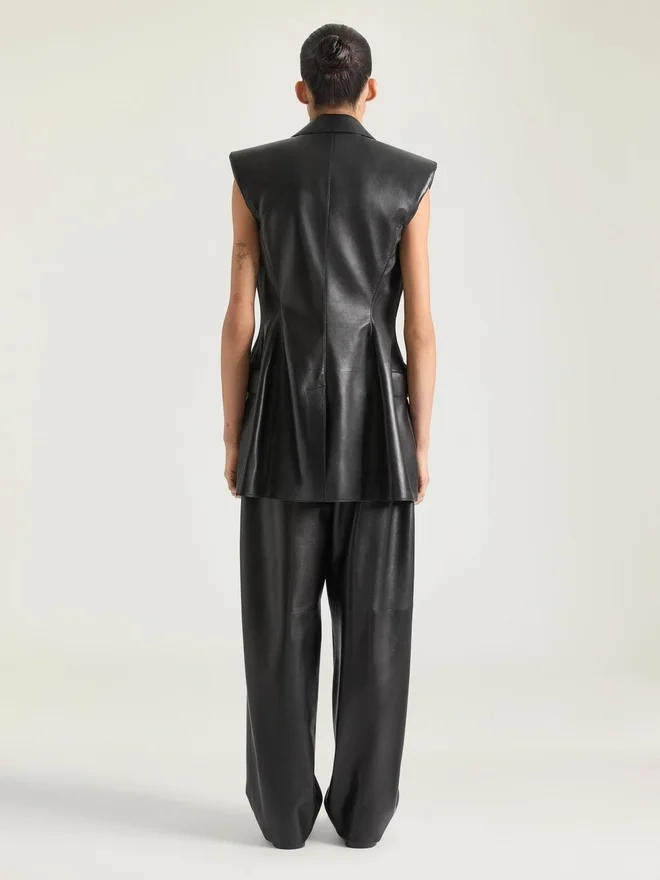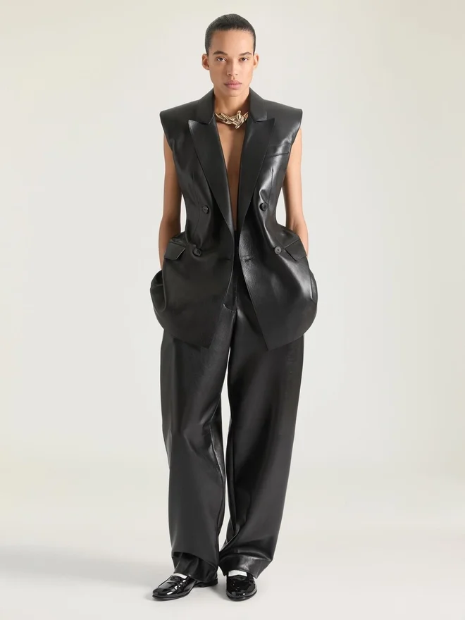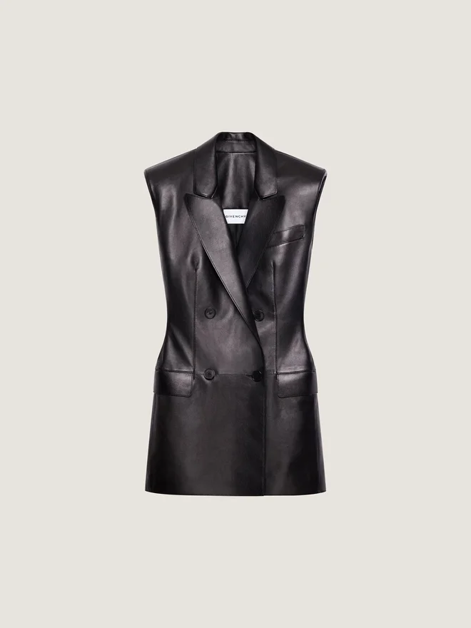 Eine gerade Silhouette mit Regular Fit und klarer Taillenlinie, die Struktur und Modernität in Einklang bringt. Ärmellose Jacke aus Plonge-Lammleder.Spitzrevers.Zweireihig.Gepolsterte Schultern.Eine Brusttasche.Zwei Pattentaschen vorne.• Das Model ist 1,77 m groß und trägt Größe 36.FarbeSchwarzMaterial100 % Lammleder. Futter: 100 % Polyester.PflegehinweiseNicht waschenNicht bügelnNicht im Wäschetrockner trocknenNicht bleichenNicht chemisch reinigenHerkunftslandItalienArtikelnummerBw30Md604J-001