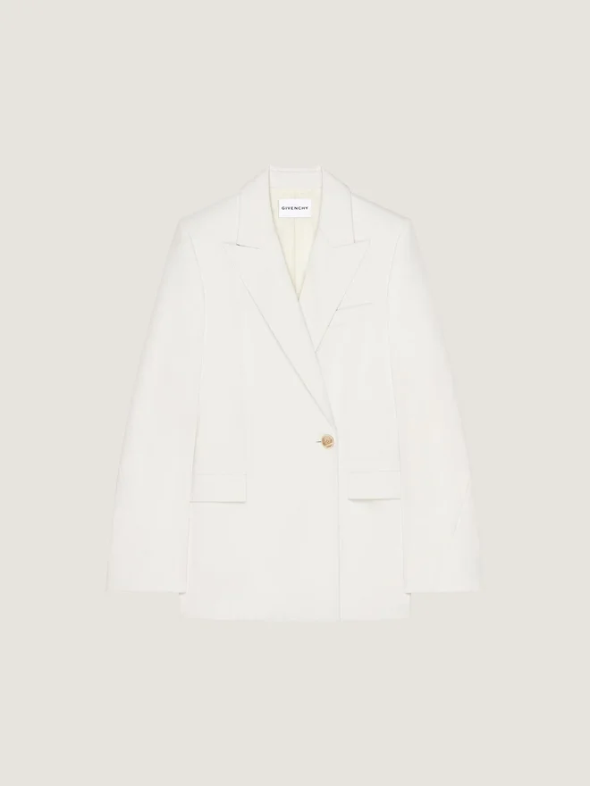 Sarah Burton hinterfragt die Kunst der Schneiderei im Givenchy-Atelier und schneidet Damenmuster mit der Handschrift der Herrenmode, um die feminine Silhouette zu betonen.Jacke aus Wolle und Mohair.Spitzrevers.Zweireiher.Geknöpfte Manschetten.Eine Brusttasche.Zwei Pattentaschen vorne.• Couture-Nähte für ein kokonartiges Volumen. • Lockere Passform. • Das Model ist 1,77 m groß und trägt Größe 36. Futter: 100 % Polyester. Ohne DampfNicht im Wäschetrockner trocknenNicht bleichenChemische Reinigung mit KohlenwasserstoffenHerkunftslandItalienProduktcodeBw30Qj10Q0-100 Pflegehinweise: In unseren Werkstätten entwerfen wir mutig und kreativ einzigartige Kleidungsstücke, die aus hochwertigen Materialien gefertigt sind. Um den Glanz Ihres Givenchy-Produkts zu bewahren, empfehlen wir, es in einem Staubbeutel aus Baumwolle an einem trockenen, kühlen Ort aufzubewahren. Für die meisten unserer Produkte wird eine chemische Reinigung empfohlen. Bitte beachten Sie unbedingt die Pflegehinweise auf dem Etikett Ihres Artikels. Besuchen Sie gerne unsere spezielle Seite oder wenden Sie sich direkt an unsere Givenchy-Teams, wenn Sie weitere Informationen wünschen.Nicht waschenBei maximaler Bügeleisentemperatur (110 °C) ohne Dampf bügelnNicht im Wäschetrockner trocknenNicht bleichenChemische Reinigung mit Kohlenwasserstoff