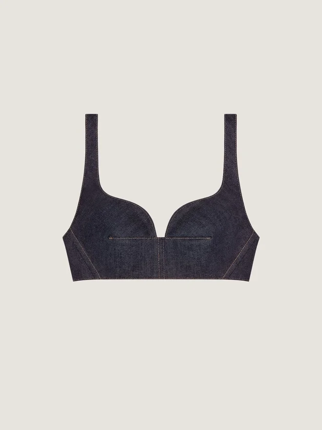 BH-Top aus Raw Denim mit Kontrastnähten. Reißverschluss und Hakenverschluss am Rücken. Das Model ist 1,77 m groß und trägt Größe 36.