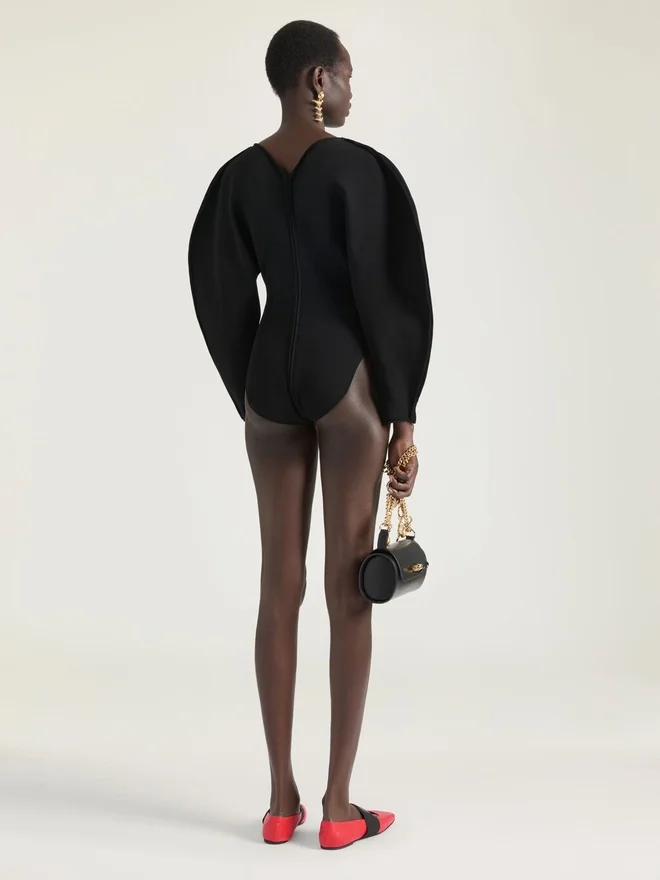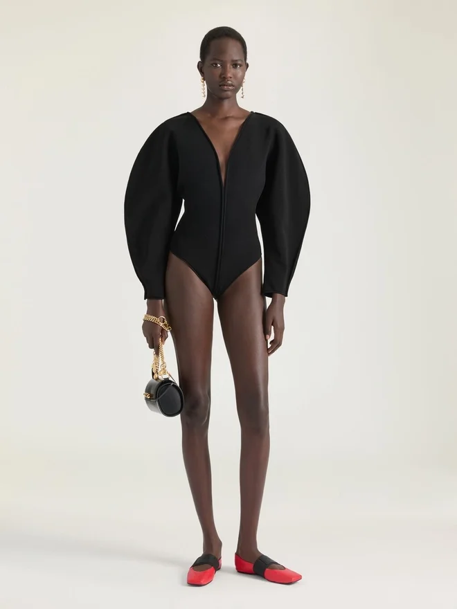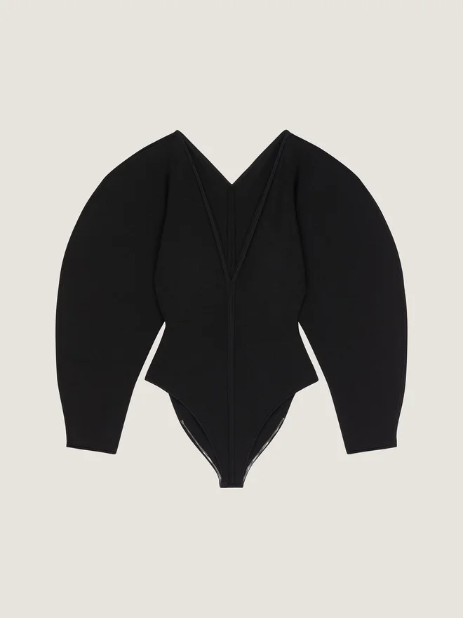 Übertriebene Volumen, überarbeitete Muster und umgekehrte Nähte formen die Kokon-Silhouette. Langärmeliger Bodysuit aus technischem