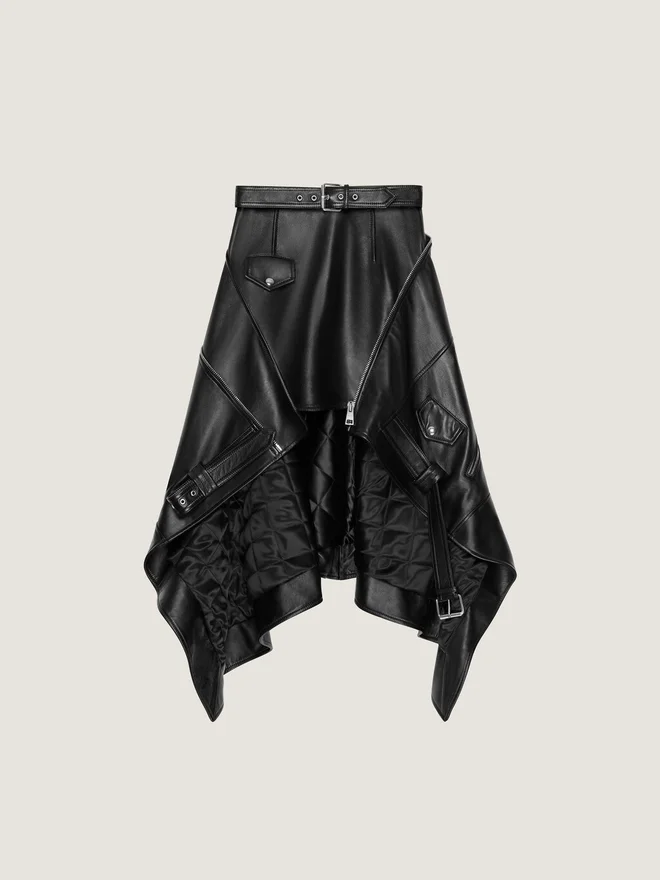 Rock aus Plonge-Lammleder.Verstellbarer Gürtel.Reißverschluss auf der Rückseite mit Givenchy-Reißverschluss.Metallreißverschlüsse an der Schräge.Zwei Pattentaschen auf der Vorderseite.Asymmetrische Länge: hinten länger.Das Model ist 1,77 m groß und trägt Größe 36. FarbeSchwarzMaterialzusammensetzung100 % Lammleder. Sekundäres Material: 100 % Polyester. Futter: 100 % Viskose.PflegehinweiseNicht waschenNicht bügelnNicht im Wäschetrockner trocknenNicht bleichenNicht chemisch reinigenHerkunftslandItalienProduktcodeBw411a604J-001
