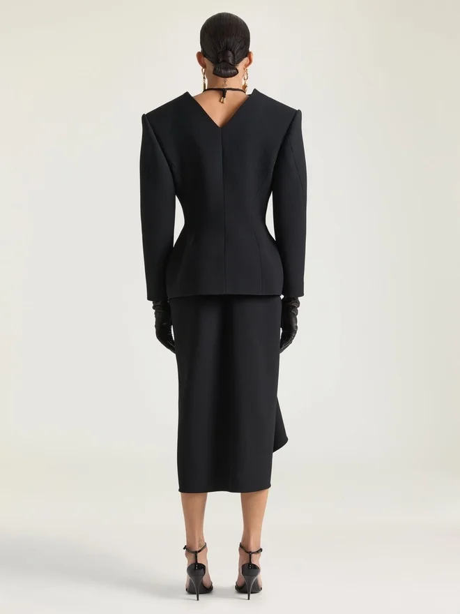 Eine Silhouette, inspiriert von der Geste, eine Lederjacke über eine Schaufensterpuppe zu drapieren. Die Stoffe sind sinnlich verdreht und um den Körper gewickelt, während Schlitze und Taschen vorne für Bewegung und Ausdruck sorgen. Midirock aus Wolle. Vorne drapiert. Verdeckter Reißverschluss hinten.Das Model ist 1,77 m groß und trägt Größe 36. Futter: 74 % Acetat, 26 % Seide.