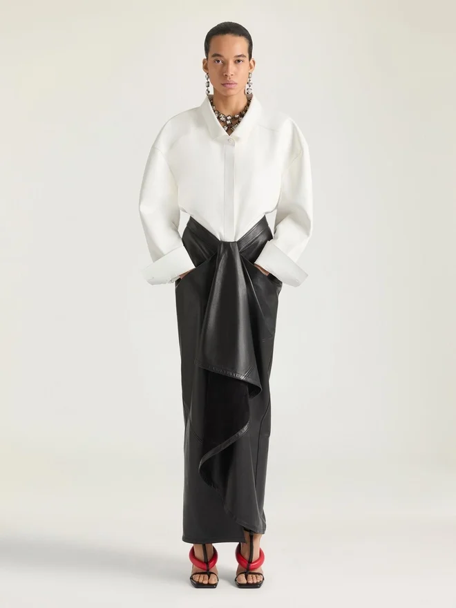 Eine Silhouette, inspiriert von der Geste, eine Lederjacke über eine Schaufensterpuppe zu drapieren. Die Stoffe sind sinnlich verdreht und um den Körper gewickelt, während Schlitze und Taschen vorne für Bewegung und Ausdruck sorgen. Langer Rock aus Plonge-Lammleder. Vorne gewickelt. Zwei Vordertaschen.• Verdeckter Reißverschluss am Rücken. • Das Model ist 1,77 m groß und trägt Größe 36. D FarbeD SchwarzD MaterialD 100 % Lammleder. Futter: 100 % Baumwolle.D PflegehinweiseNicht waschenNicht bügelnNicht im Wäschetrockner trocknenNicht bleichenNicht chemisch reinigenHerkunftslandItalienArtikelnummerBw412E604J-001