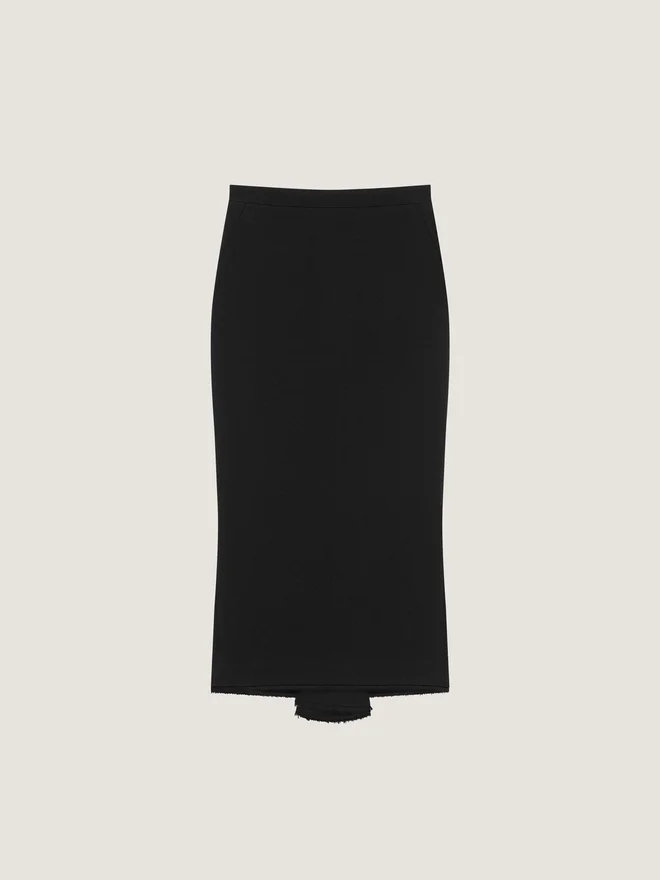 Midirock aus doppeltem Wollkrepp. Kickback-Detail. Verdeckter Reißverschluss am Rücken. Unversäuberte Kanten am Saum. Maße des Models