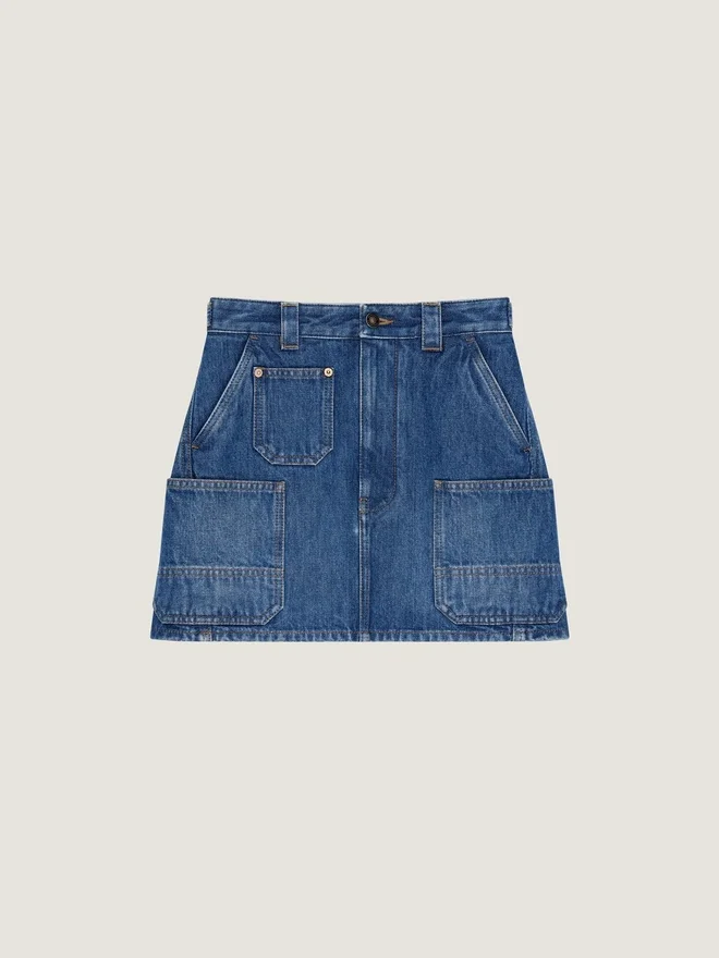 Mini-Cargo-Rock aus mittelblauem Denim. Gesticktes Givenchy Paris-Patch auf der Rückseite. Taille mit Schlaufen, Reißverschluss und Knopfverschluss.
