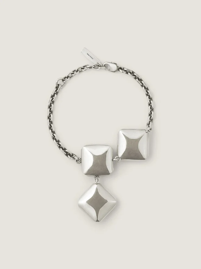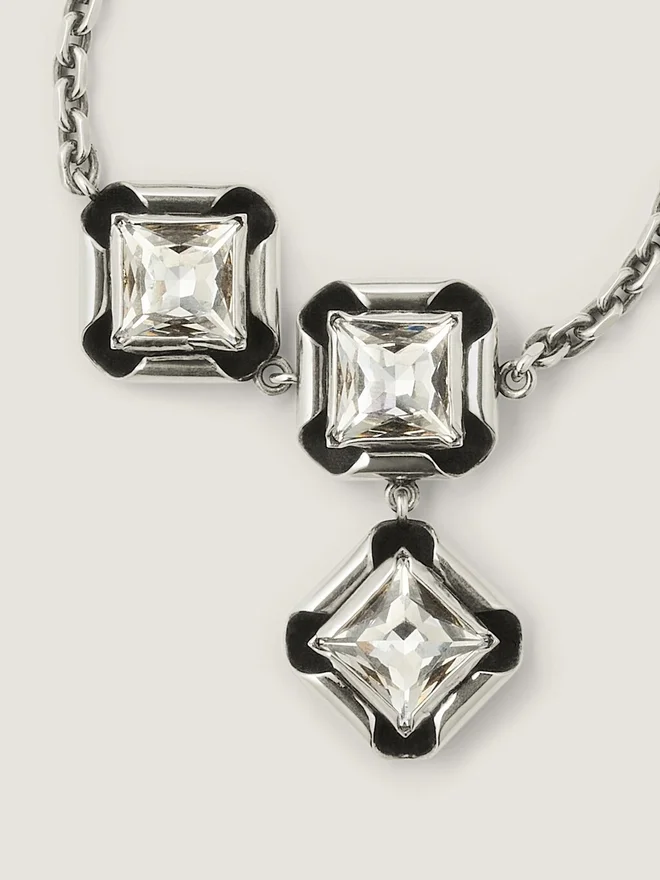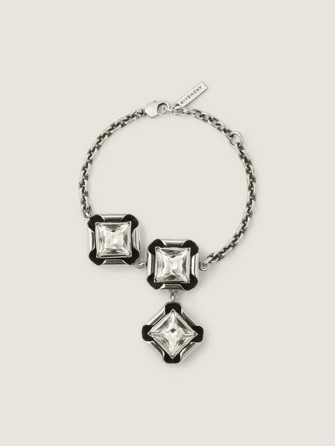 Kettenarmband aus silberfarbenem, oxidiertem Metall mit quadratischen und rautenförmigen Kristallen für einen dekonstruierten Look. Dekonstruierte