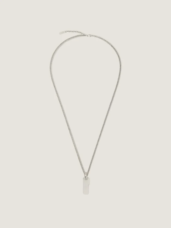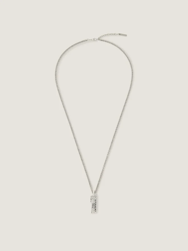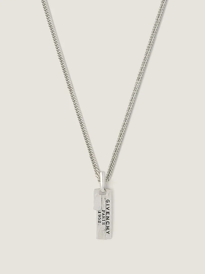 Kettenhalskette aus Metall mit silberfarbenem Finish. Givenchy Tape-Linie. Strukturierter Metallanhänger mit „Givenchy Paris 1952“ in schwarzem Emaille.