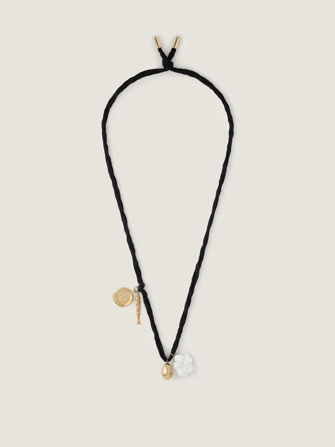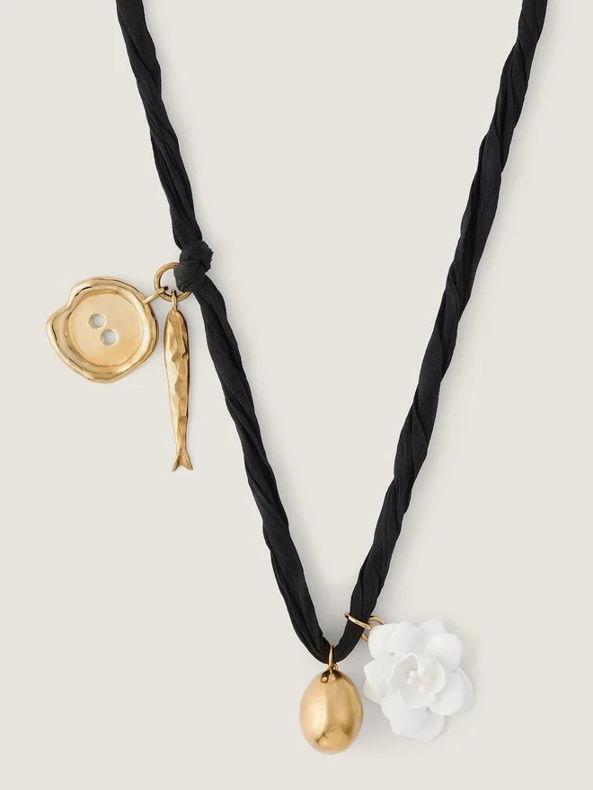 Halskette aus Seidenkordel mit Anhängern aus Metall und Emaille.Lucky Charms-Kollektion.Lose Anhänger, inspiriert von Hubert de Givenchys Objekten: Emailleblume, Metall-Ei mit Goldfinish, Knopf und Fisch.Knotenverschluss zur Längenverstellung mit Endstücken aus Metall mit Givenchy-Gravur.ColorGoldgelbComposition100 % Messing. Sekundäres Material: 100 % Seide. Zusätzliches Material: 100 % Emaille.AbmessungenLänge: 41,3 ZollGewicht50 gHerkunftslandItalienProduktcodeBf00T1F07H-710 Pflegehinweise zur Erhaltung der Qualität Ihres Schmucks: empfehlen wir, ihn vorsichtig zu behandeln und regelmäßig mit einem weichen Tuch zu reinigen. Wenn Sie ihn nicht tragen, bewahren Sie ihn am besten in der Originalverpackung von Givenchy auf und trennen Sie ihn von anderem Schmuck. Wir raten außerdem davon ab, ihn mit Chemikalien wie Haarspray, Parfüm, Cremes, Haushaltsreinigern usw. in Kontakt zu bringen. Diese können zu vorzeitigem Verschleiß des Metalls, der Perlen und bestimmter Edelsteine führen. Feuchte oder salzhaltige Umgebungen können ebenfalls irreversible Schäden verursachen. Wir empfehlen daher, Ihren Schmuck beim Schwimmen oder bei körperlichen Aktivitäten abzulegen. Besuchen Sie gerne unsere spezielle Seite oder wenden Sie sich direkt an unser Givenchy-Team, wenn Sie weitere Informationen wünschen.