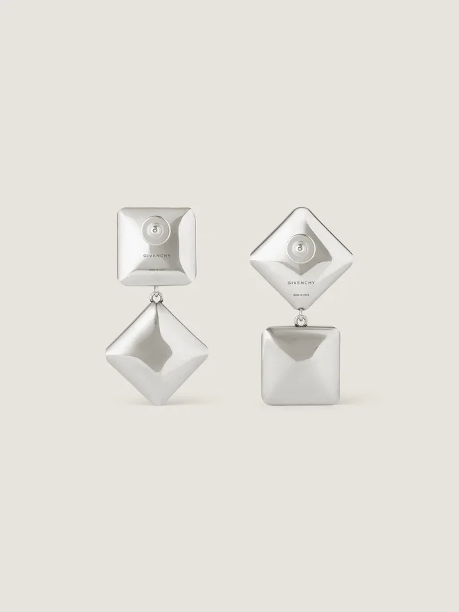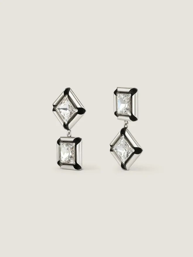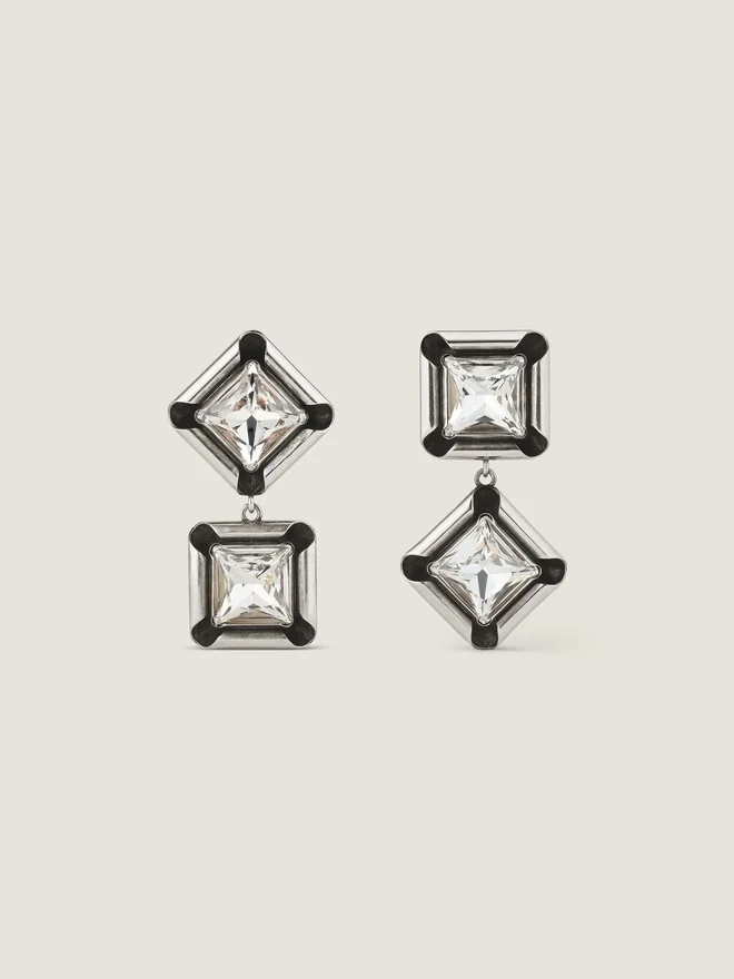 Ohrringe mit Anhänger aus silberfarbenem, oxidiertem Metall mit großen quadratischen und rautenförmigen Kristallen. Kollektion „Deconstructed Crystals“.