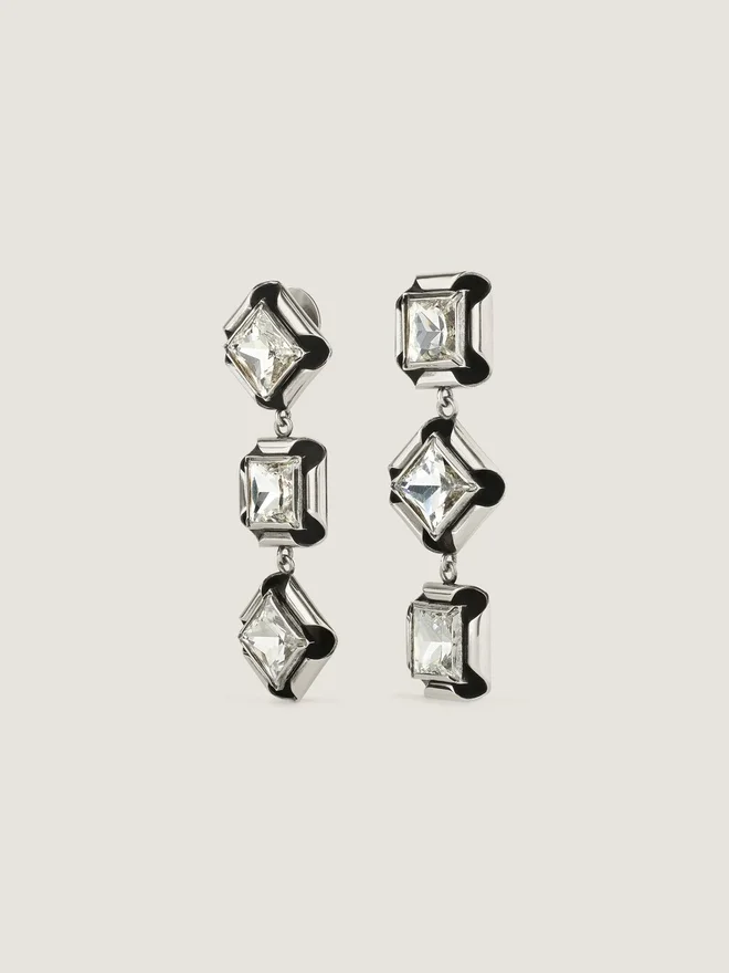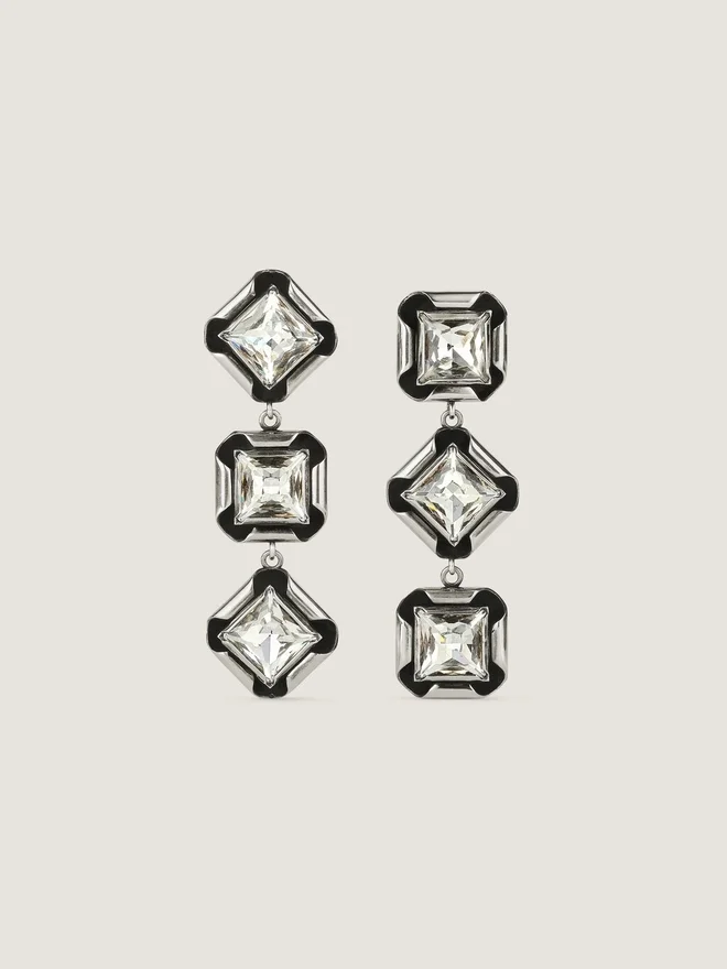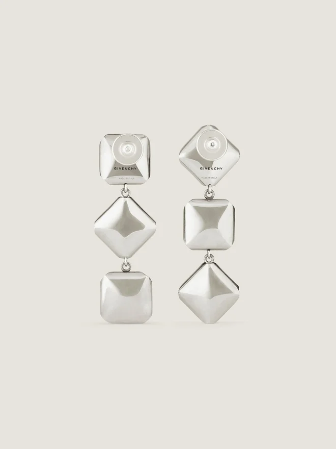 Ohrringe mit Anhänger aus silberfarbenem, oxidiertem Metall mit quadratischen und rautenförmigen Kristallen. „Deconstructed Crystals“-Linie. Givenchy