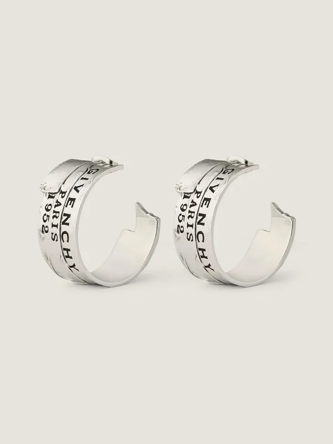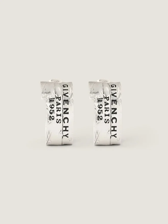 Ohrringe aus silberfarbenem, strukturiertem Metall. Givenchy Tape-Linie. „Givenchy Paris 1952“ in schwarzem Emaille auf der Vorderseite. Givenchy
