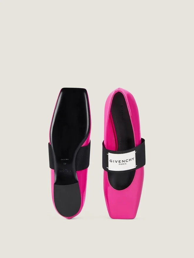 Flache Ballerinas aus lackiertem Kalbsleder. Abgeschrägte, eckige Linie. Elastisches Band mit Givenchy Paris-Lederetikett. Givenchy
