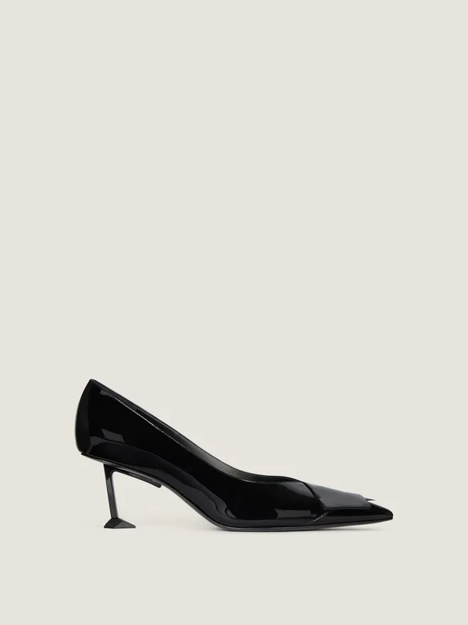 Pumps aus lackiertem Kalbsleder. Boudoir-Linie. Aufgesetzte, gefaltete Lederverzierung. Spitz zulaufende Zehenpartie. Geformter Metallabsatz mit
