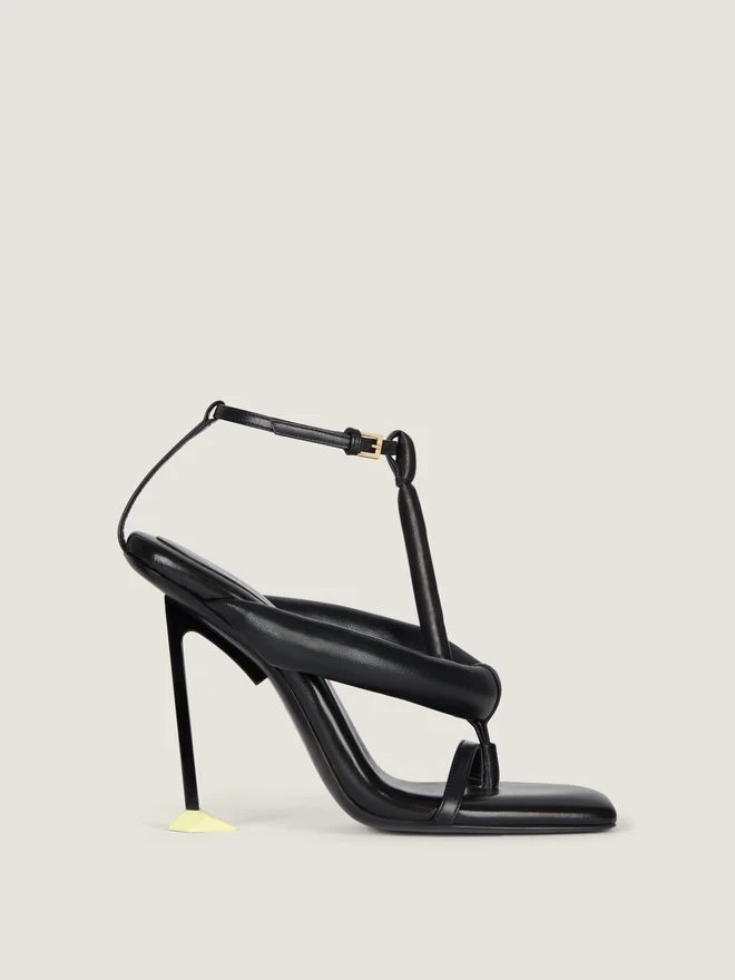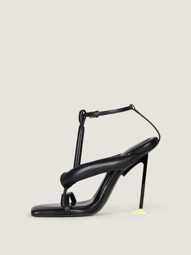 Riemchensandalen mit Absatz aus Nappa-Kalbsleder. Boudoir-Linie. Schmaler Knöchelriemen mit Metallschnalle. Quadratische Zehenpartie. Geformter Metallabsatz mit