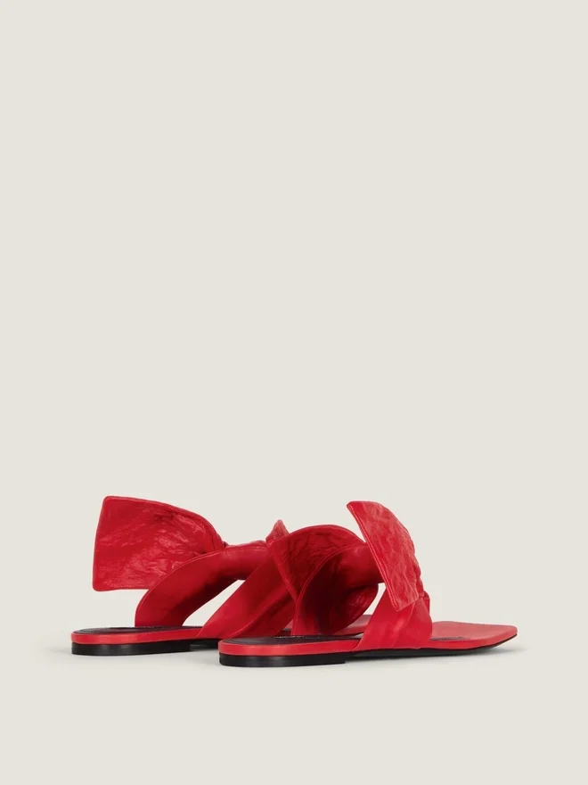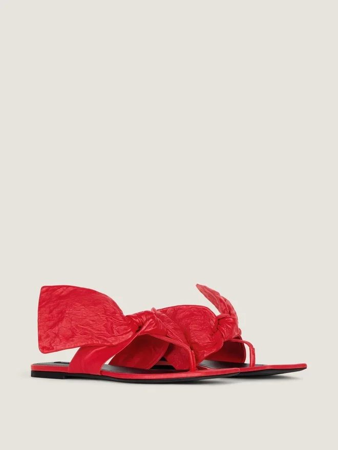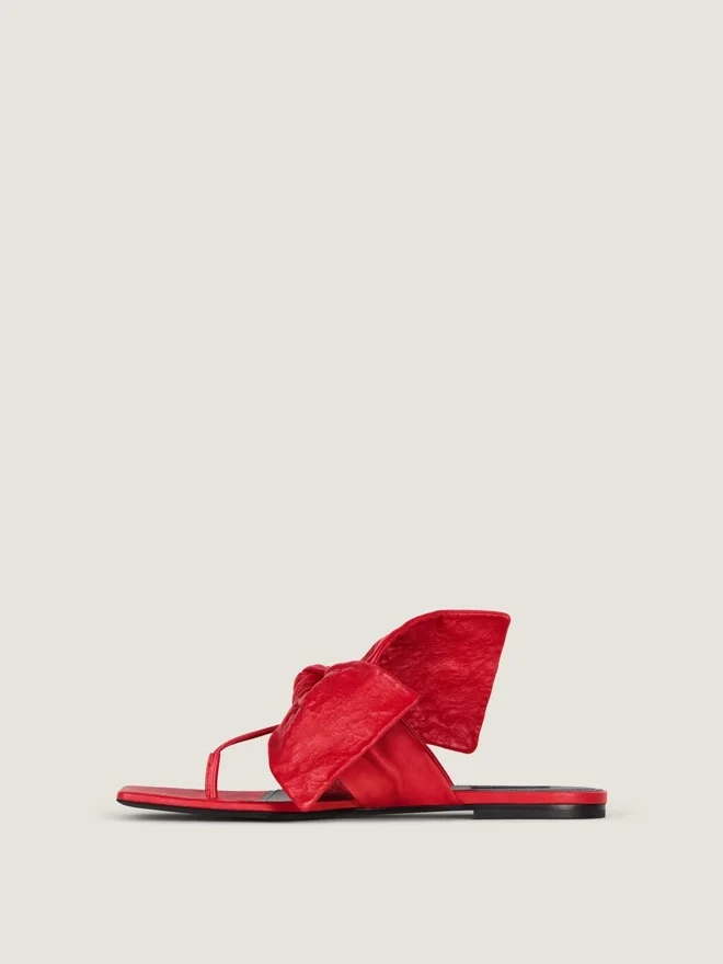 Flache Zehensandalen aus Nappaleder. Boudoir-Linie. Große, formbeständige Lederschleife, die ihr Volumen und ihre Struktur beibehält, genäht