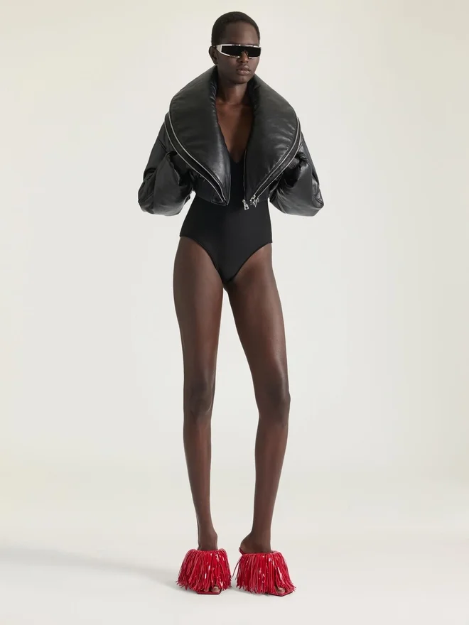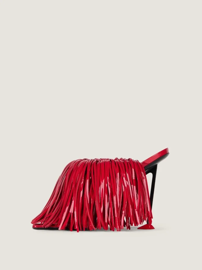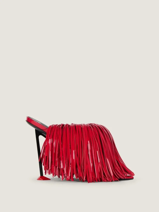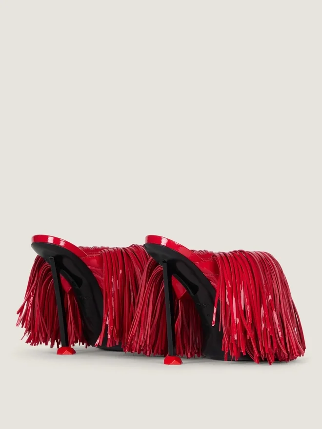 Mules mit Fransen und Absatz aus lackiertem Kalbsleder. Boudoir-Linie. Quadratische offene Zehenpartie. Geformter Metallabsatz mit kontrastierendem