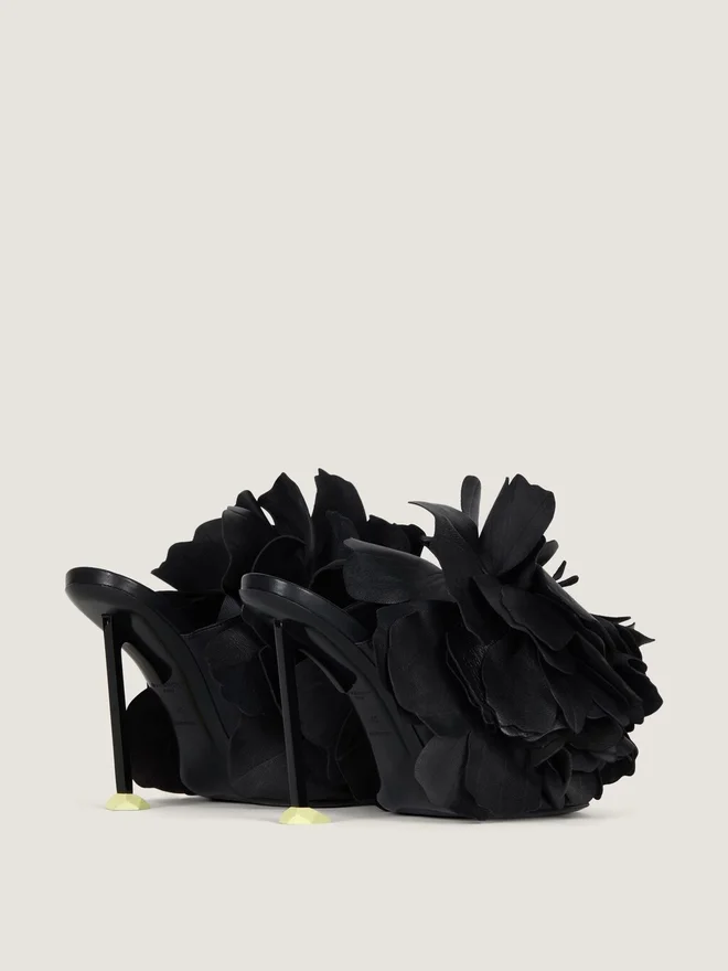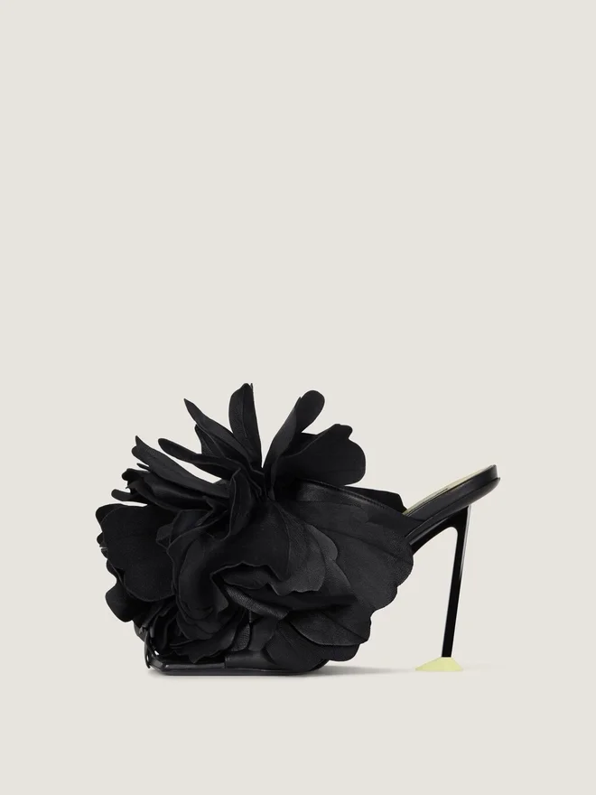 Mules mit Absatz aus Kalbsleder. Boudoir-Linie. Große, aufgenähte Rosenblätter aus Leder. Quadratische, offene Zehenpartie. Geformter Metallabsatz