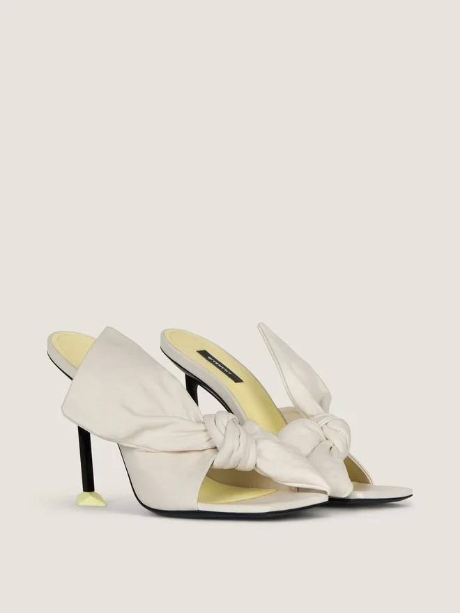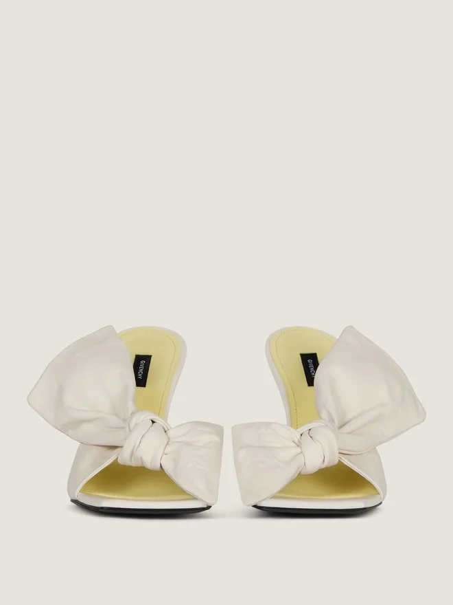 Mules mit Absatz aus Nappaleder.Boudoir-Linie.Große, formbeständige Lederschleife, die ihr Volumen und ihre Struktur beibehält, oben aufgenäht.Quadratische, offene Zehenpartie.Geformter Metallabsatz mit kontrastierender, rautenförmiger Spitze. Givenchy-Label auf einer kontrastierenden Lederinnensohle. Absatzhöhe: 9,4 cm. Farbe: Elfenbein Material: 100 % Lammleder. Futter: 100 % Rindsleder.HerkunftslandItalienProduktcodeBe30B7E2H6-105 Pflegehinweise: Jedes Paar Schuhe, das in unseren Werkstätten gefertigt wird, ist ein Unikat und besteht aus außergewöhnlichen Materialien. Diese Materialien, die über mehrere Jahre hinweg sorgfältig ausgewählt wurden, erfordern regelmäßige Pflege, damit Sie ihre Schönheit und ihren Komfort über lange Zeit genießen können. Um ihren Glanz zu bewahren, empfehlen wir, sie keiner Hitze oder Lichtquellen auszusetzen und den Kontakt mit Flüssigkeiten oder chemischen Produkten wie Parfüms, Cremes, Haushaltsreinigern usw. zu vermeiden. Wenn Sie Ihre Givenchy-Schuhe nicht tragen, empfehlen wir, sie sorgfältig in ihrer Originalverpackung an einem trockenen und kühlen Ort aufzubewahren. Feuchtigkeit könnte sie beschädigen. Besuchen Sie gerne unsere spezielle Seite oder wenden Sie sich direkt an unsere Givenchy-Teams, wenn Sie weitere Informationen wünschen.