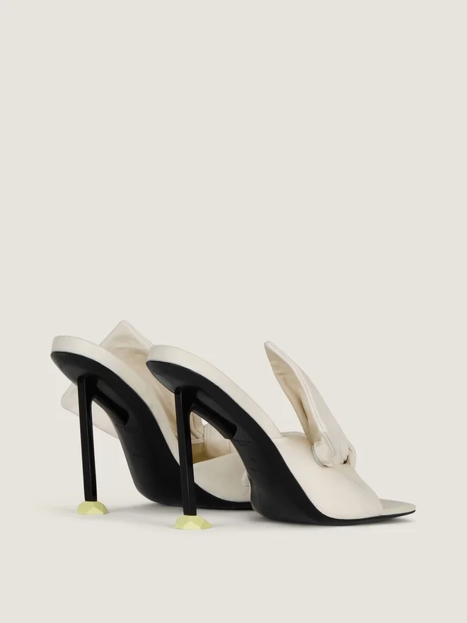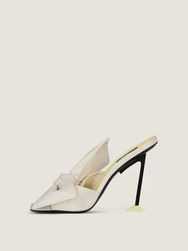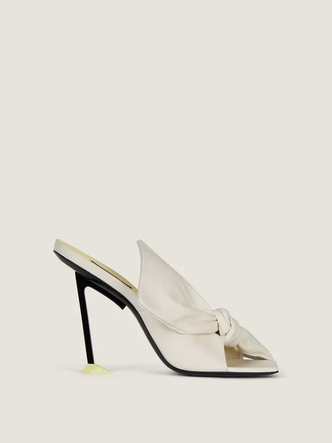 Mules mit Absatz aus Nappaleder. Boudoir-Linie. Große, formbeständige Lederschleife, die ihr Volumen und ihre Struktur beibehält, aufgenäht
