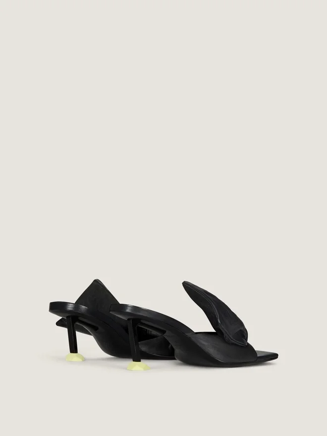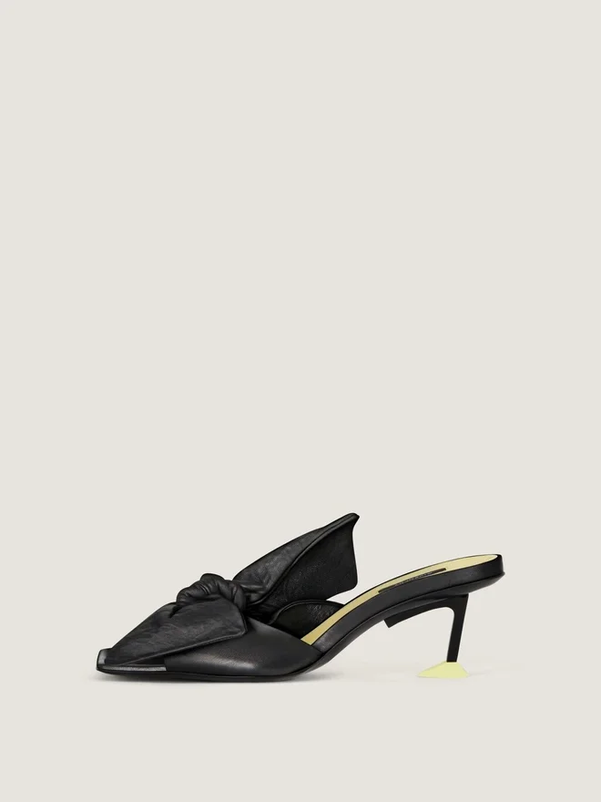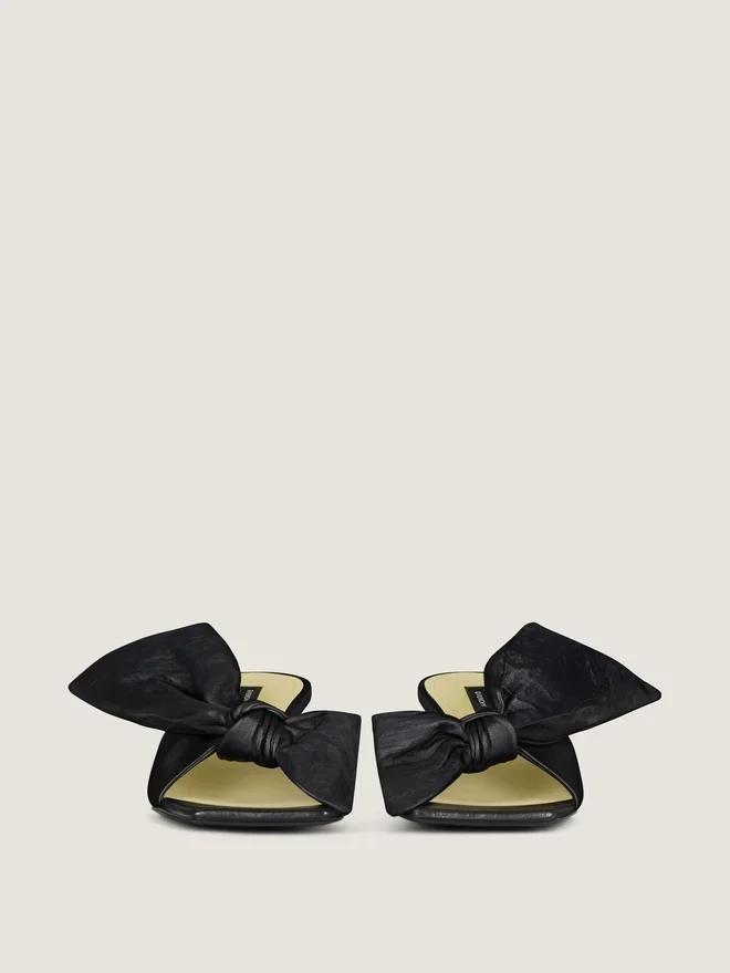 Mules mit Absatz aus Nappaleder. Boudoir-Linie. Große, formbeständige Lederschleife, die ihr Volumen und ihre Struktur beibehält, aufgenäht