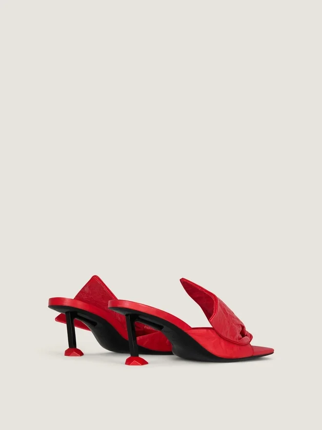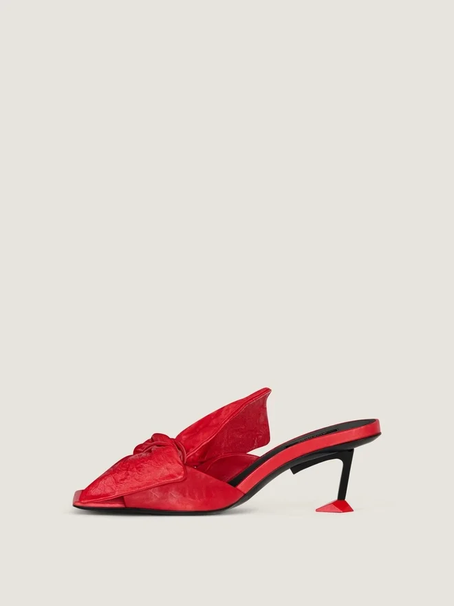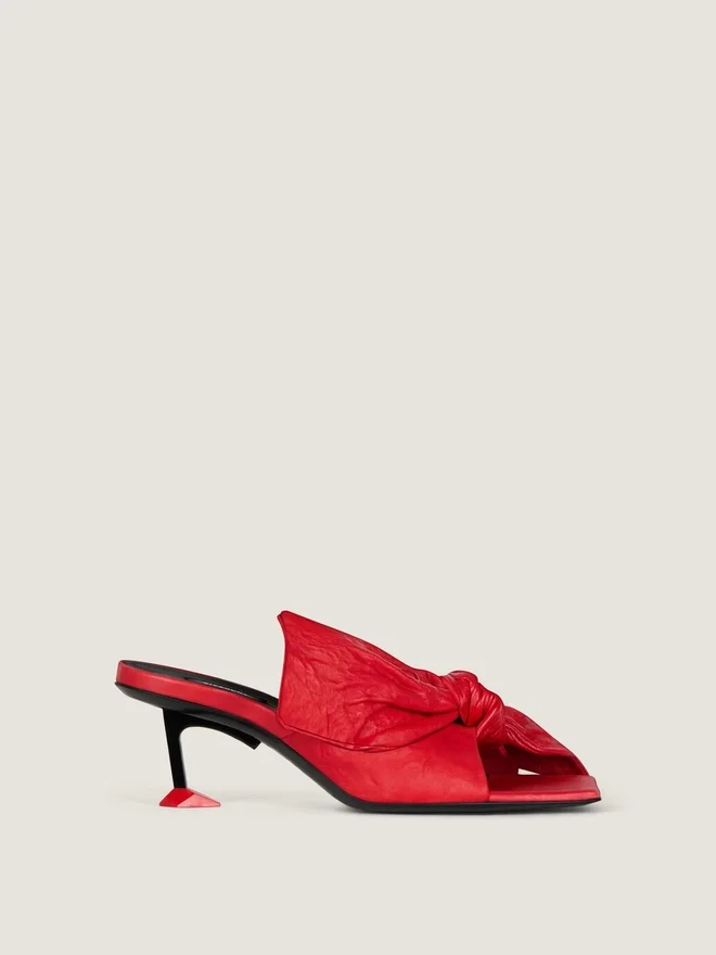 Mules mit Absatz aus Nappaleder. Boudoir-Linie. Große, formbeständige Lederschleife, die ihr Volumen und ihre Struktur beibehält, aufgenäht