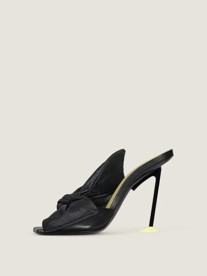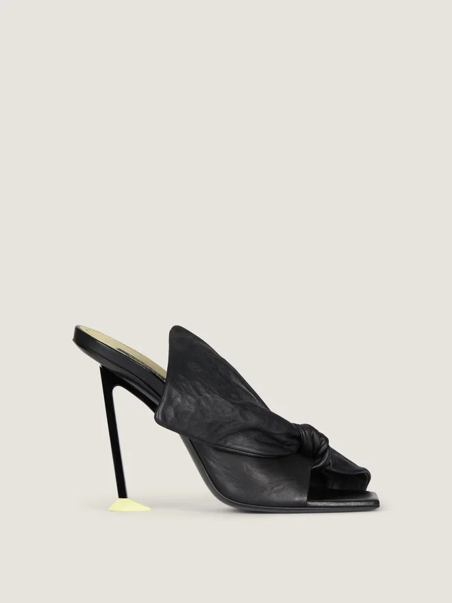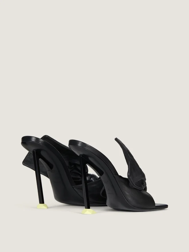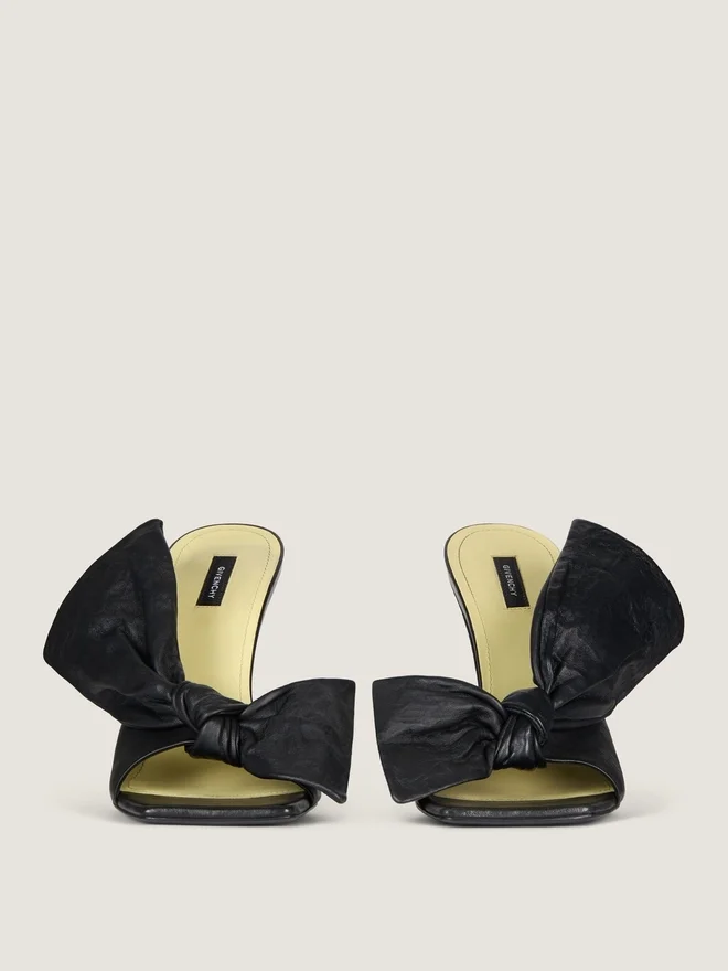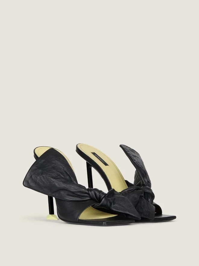 Mules mit Absatz aus Nappaleder. Boudoir-Linie. Große, formbeständige Lederschleife, die ihr Volumen und ihre Struktur beibehält, aufgenäht