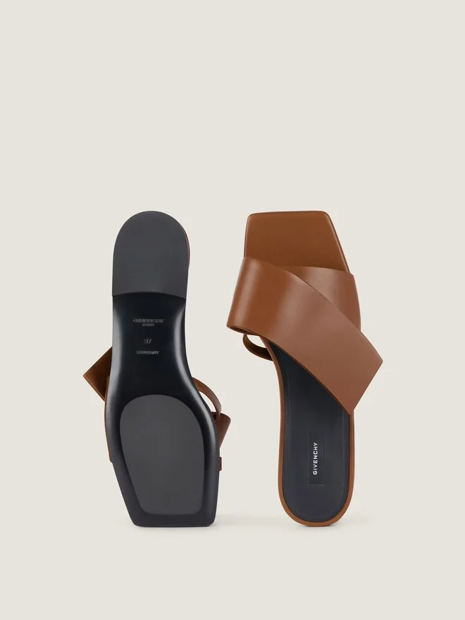 Flache Sandalen aus Kalbsleder. Abgeschrägte, eckige Linie. Gedrehter Riemen oben. Eckige Zehenpartie. Givenchy-Label auf der Lederinnensohle.